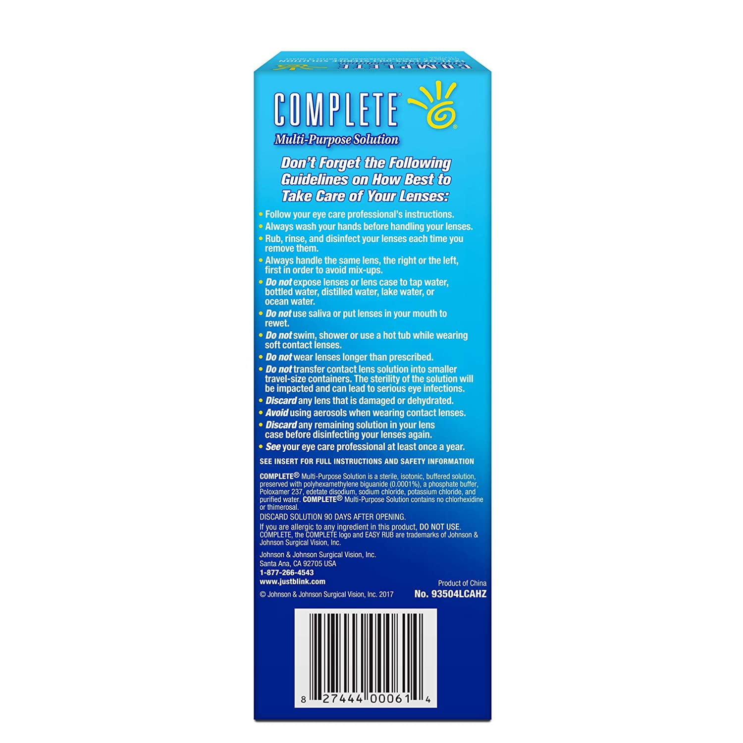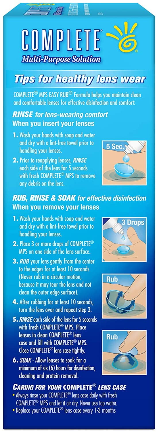 If it doesn’t protect, it isn’t complete. Active Ingredients: A Sterile, Isotonic, Buffered Solution Preserved With Polyhexamethylene Biguanide (0.0001%); a Phosphate Buffer; Poloxamer 237; Edetate Disodium; Sodium Chloride; Potassium Chloride; Purified Water Uses: For soft contact lenses: Cleans, rinses, stores, disinfects, removes protein. For effective disinfection and comfort. Disinfection: With its unique Easy Rub formula, Complete MPS promotes disinfection by removing and killing a broad range of bacteria and microorganisms on your lens to help protect your eyes against infection. Complete MPS Easy Rub formula removes protein and debris to thoroughly clean your lenses. Comfort: Complete Easy Rub formula contains poloxamer 237, an effective cleaner that is also gentle on the eyes. With 4 beneficial electrolytes, Complete Easy Rub formula helps promote a healthy lens wearing experience. COMPLETE multi-purpose solution contains no chlorhexidine or thimerosal.