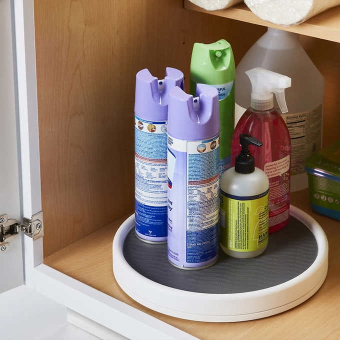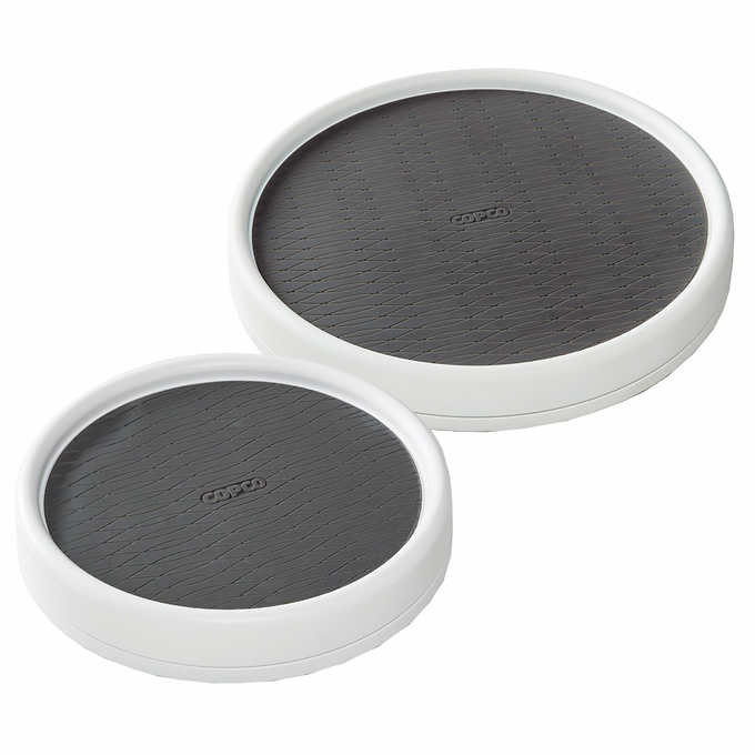 Copco Pro Turntables, 2-piece Set Includes: (1) 9" turntable (1) 12" turntable Features: Set of Two Rotating Turntable Organizers -Makes items in cabinets and on counters accessible with a simple spin -Includes two sizes -Durable plastic construction accommodates heavier items -Heavy-duty ball bearings provide a smooth, quiet spin -Nonskid liners on platforms keep items in place -Soft, nonskid bottom keeps turntable stable and protects surfaces0
