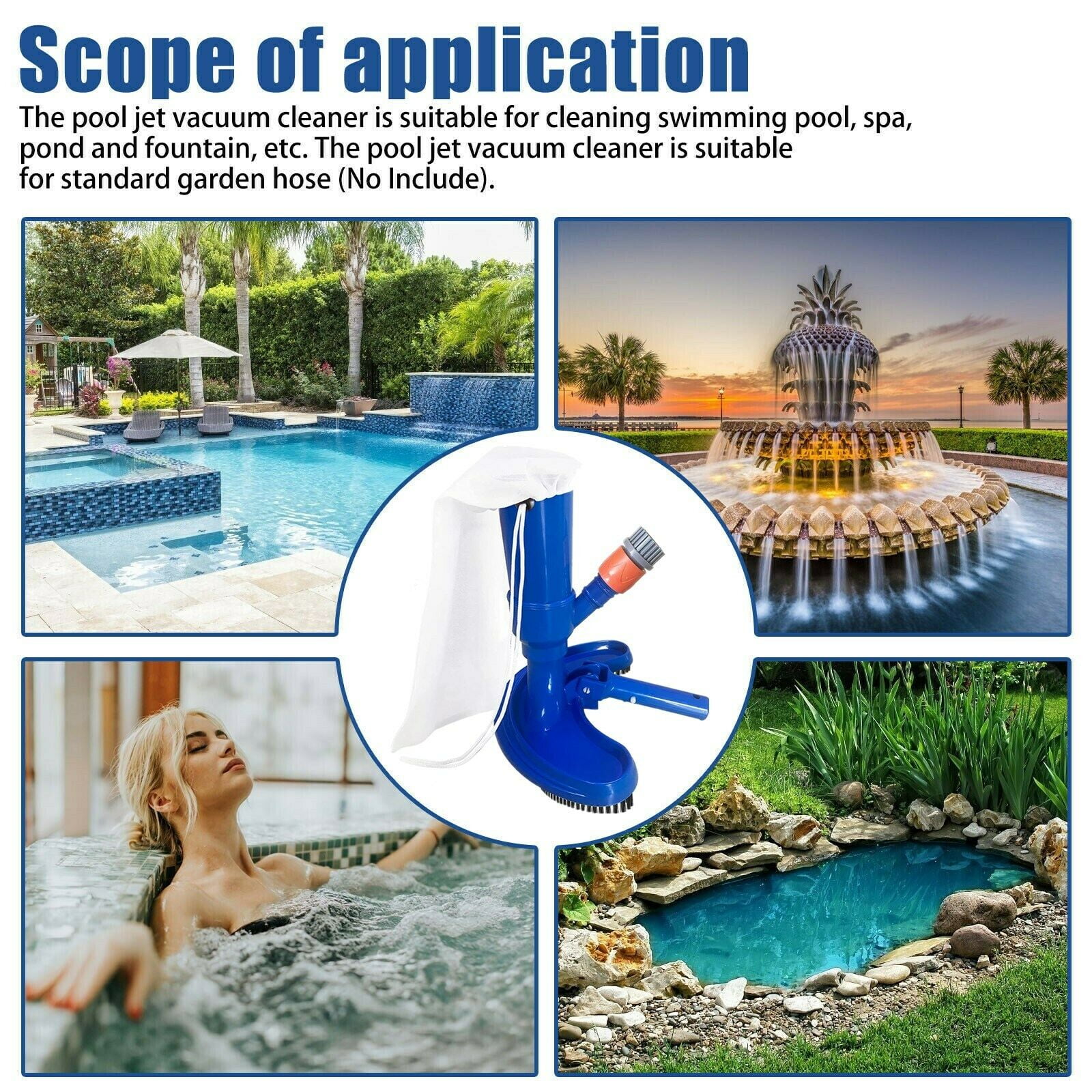 - The pool jet vacuum cleaner is suitable for cleaning swimming pool, spa, pond and fountain, etc. The pool jet vacuum cleaner is suitable for standard garden hose ( No Include).