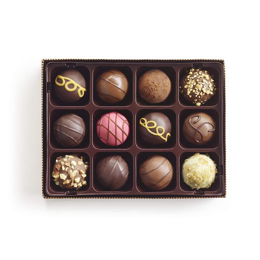 Truffles, Signature, Box 12 CT 9 flavors. Flavors include: salted caramel, Aztec spice, creme brulee, strawberry creme tarte (naturally flavored with other natural flavors), milk chocolate mousse, hazelnut crunch. Belgium 1926. Godiva Signature Truffles combines legendary classics with innovative flavors to deliver an unparalleled taste experience for the most discerning chocolate lover. A selection of the most popular flavors is featured in this gift box assortment. Milk chocolate (2); 50% dark chocolate (2); salted caramel (2); hazelnut crunch (1), salted almond (1); creme brulee (1); Aztec spice (1); strawberry creme tarte (1); milk chocolate mousse (1). Partially produced with genetic engineering. www.godiva.com. To ensure product quality, please keep this package stored in a cool place, at or below 65 degrees F (18 degrees C). May contain other tree nuts. Do not purchase if open or torn. 12 truffles [8.3 oz (235 g)] New York, NY 10001