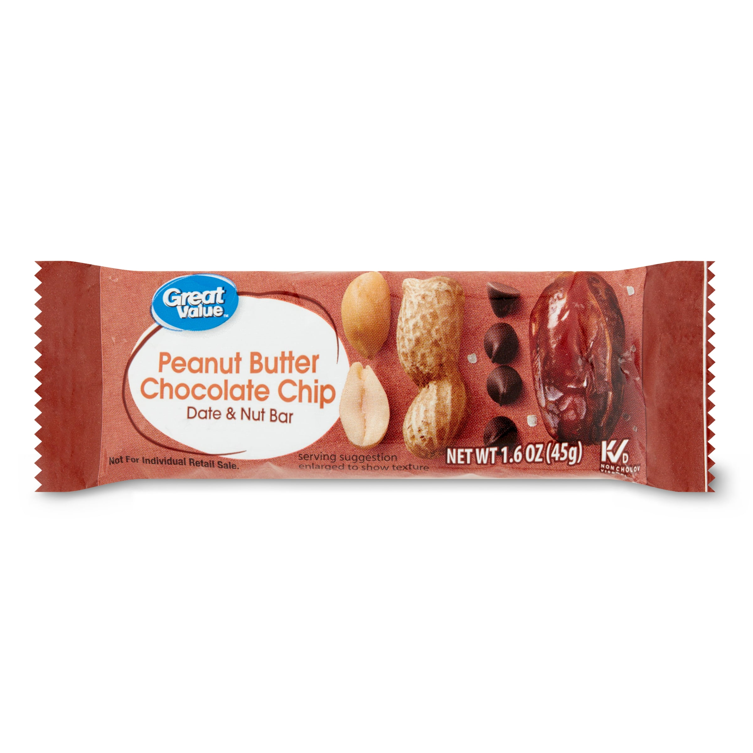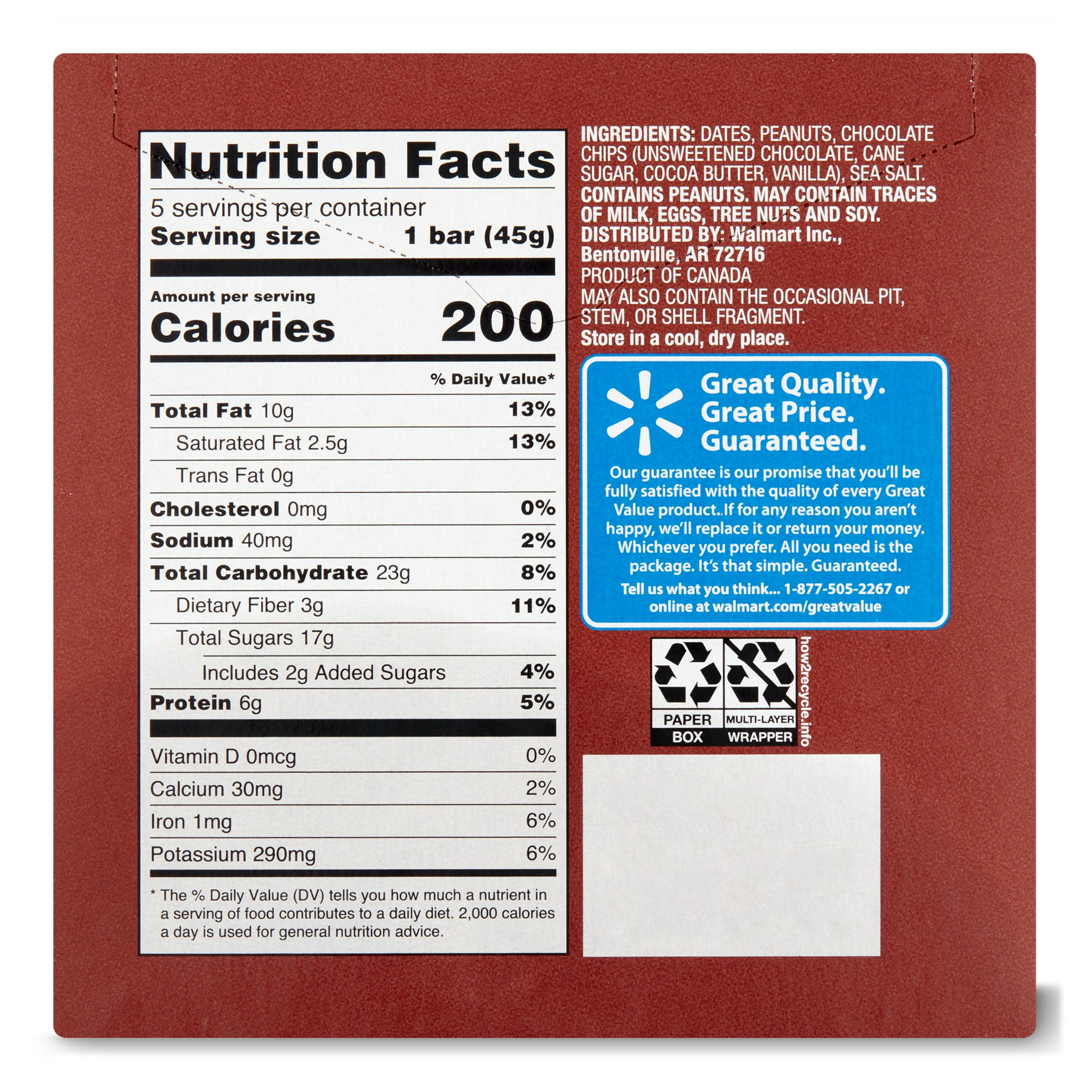 Great Value Peanut Butter Chocolate Chip Date and Nut Bars are a healthy and satisfying snack that the entire family will enjoy. These bars are packed with dates, peanuts, and chocolate chips. Each bar has six grams of protein and 200 calories. Individually wrapped, these nut bars are perfect for snacking on the go or for packing in lunches. Add some sweet and salty crunch to your snack time with Great Value Peanut Butter Chocolate Chip Date and Nut Bars.