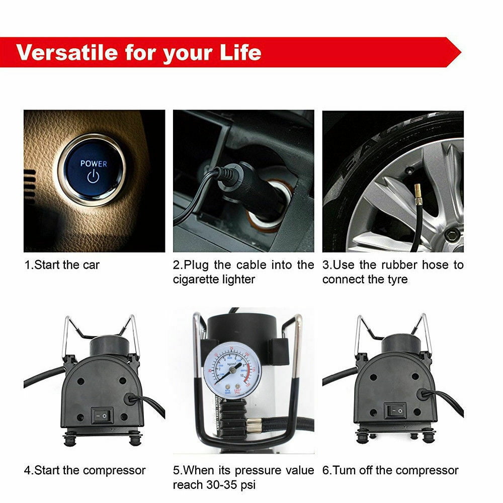 【DOUBLE CYLINDER FAST INFLATION】Our air compressor Unlike regular air compressor tire inflators that take ages.ours dsource copper wire armature for this tire inflator it can maximum pressure 150PSI,it can inflate the 195/55/R15—-225/65/R17 car tire from 0 to 35psi under 3 minutes. Please NOTE that after 10-15 minutes of continuous use, let the air compressor rest and cool for an equal amount of time at a minimum before continuing use.