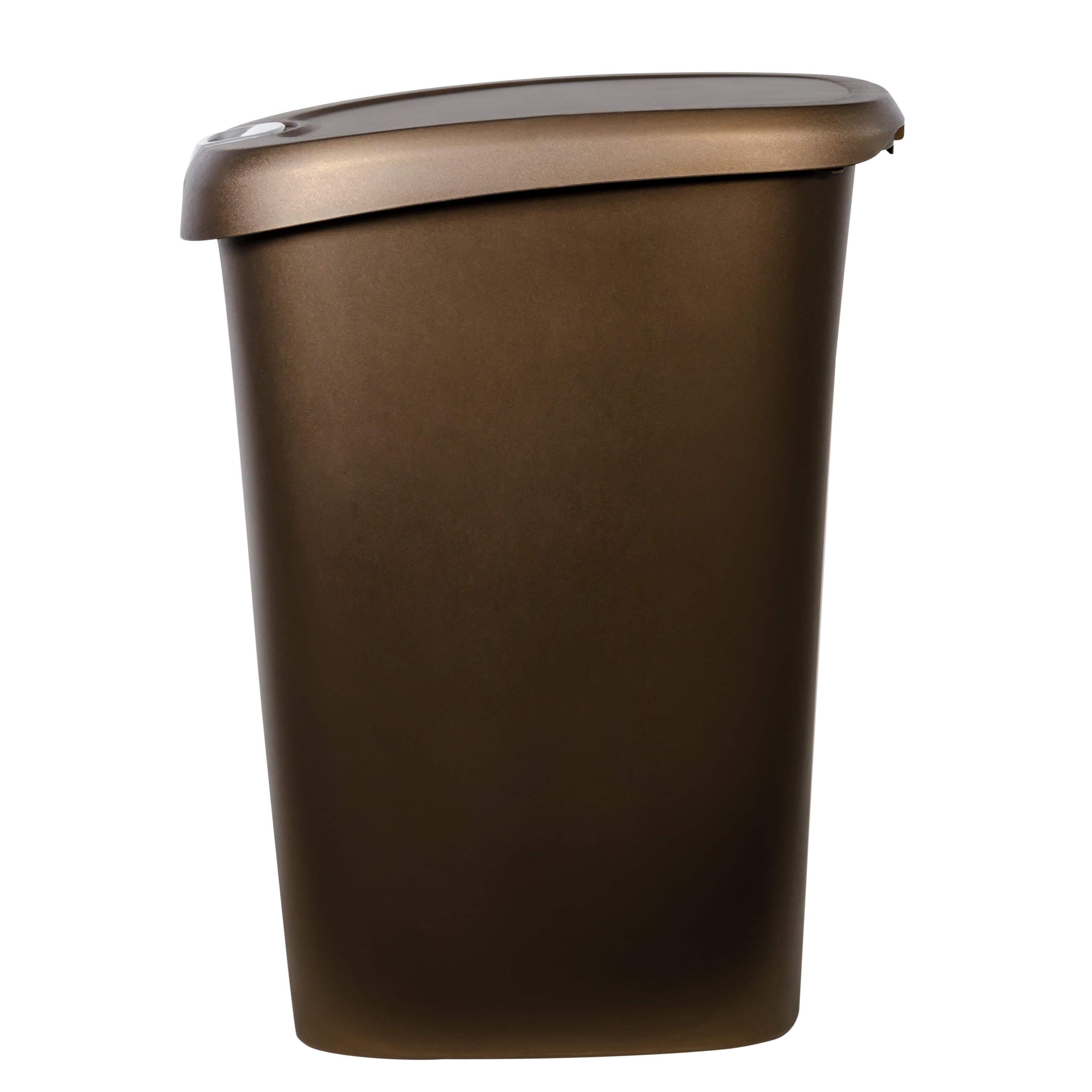 The Hefty Lockable Step On Plastic Trash Can has a locking lid to help keep curious pets and children out and easily avoid messes. The slim design in bronze with a 12-gallon capacity make this an ideal large kitchen trash can great for busy families who want to limit trips to take the garbage out. Use the step on pedal for easy, hands-free trash disposal. It also uses standard 13 gallon kitchen trash bag.