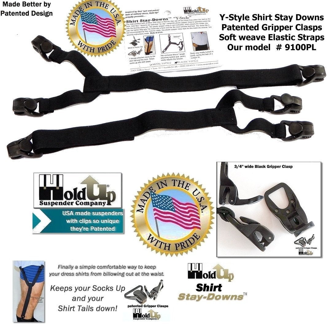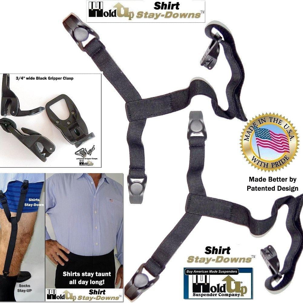 Holdup Suspender Company makes these patented Shirt Stay-Downs that gives you that best dressed fitted shirt look as they keep yourshirt tails tightly in your pants. Inspired by those tricks to get that "spit and polish" look during military dress code inspections comes the Holdup trademarked Stay Downs. Get the proven simple solution to eliminate bulging rumpled looking dress or uniform shirts billowing out at your waist. These comfortable Y-style Shirt Stay-Downs simply attach at one end to your socks in seconds with patented Gripper clasps. The other end attaches to your shirt tail, and the smooth Velcro length adjustment system is used to lock in place the adjusted length so your shirt looks tight when sitting or standing in total comfort. The patented gripper clasps are cam activated which means the harder you pull on them the tighter they grip. The simple way to keep shirt tucked in place, while keeping your socks up. The results are impressive and last all day long. Made in the U.S.A and come with a 100% 30 day satisfaction guarantee. Read all the other brand reviews and then these Dress shirt tail stays, or men’s shirt tail garters, have none of the problems and work all day long without popping off when sitting or standing.Holdup Suspender Company was granted aShirt Stay US Utility designPatent # 8832866 B2in September 2014 andUS Patent # 9339071 B2 in May 2016 Patented black composite plastic No-slip Gripper Clasps won’t pop-off shirt tail; The Gripper Clasps are cam activated and grip tighter the harder you pull on them; Smooth Velcro length / tension adjuster holds shirt tails taunt all day long; These Y-style shirt stays hold better the harder you pull on them and clips now are double stitched; These patented Shirt Stays are easier to attach and superior to all other styles sold at Amazon;Hold-ups patented Shirt Stay-Downs gives you that best dressed fitted shirt look. Inspired by those tricks to get that "spit and polish" look during military dress code inspections. Comes a simple solution to eliminate bulging rumpled looking dress shirts billowing out at your waist. These comfortable Y-style Shirt Stay-Downs simply attach at one end to your socks in seconds with patented Gripper clasps. The other end attaches to your shirt tail, and the smooth Velcro length adjustment system is used to lock in place the adjusted length. The patented gripper clasps are cam activated which means the harder you pull on them the tighter they grip. The simple way to keep shirt tucked in place, while keeping your socks up. The results are impressive and last all day long. Made in the U.S.A and come with a 100% 30 day satisfaction guarantee. Read all the other brand reviews and then these Dress shirt tail stays, or shirt tail garters, have none of the problems and work all day long without popping off when sitting or standing.Holdup Suspender Company was granted aShirt Stay US Utility designPatent # 8832866 B2in September 2014 andUS Patent # 9339071 B2 in May 2016 Patented black composite plastic No-slip Gripper Clasps won’t pop-off shirt tail The Gripper Clasps are cam activated and grip tighter the harder you pull on them Smooth Velcro length / tension adjuster holds shirt tails taunt all day long These Y-style shirt stays hold better the harder you pull on them and clips now are double stitched These patented Shirt Stays are easier to attach and superior to all other styles sold at Amazon