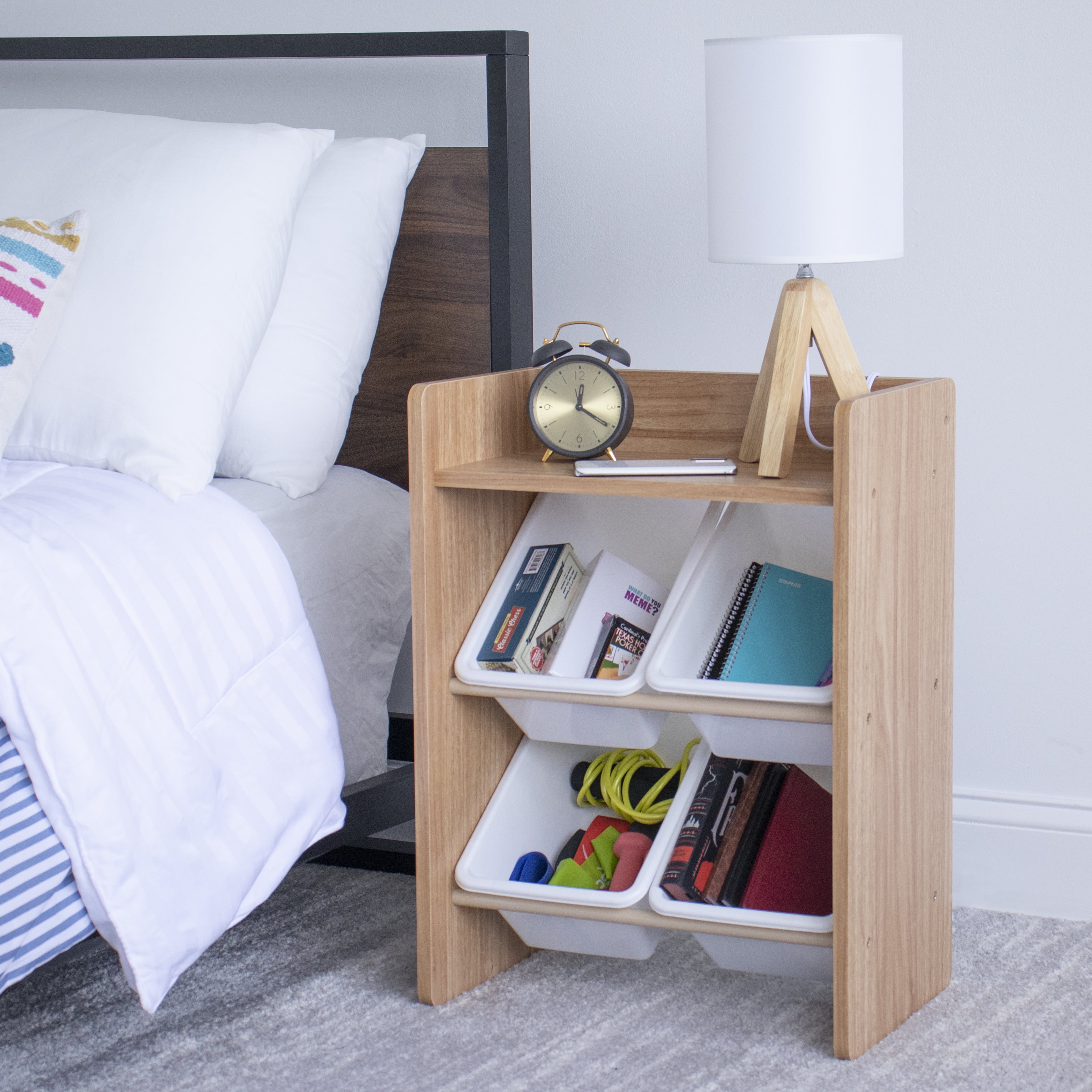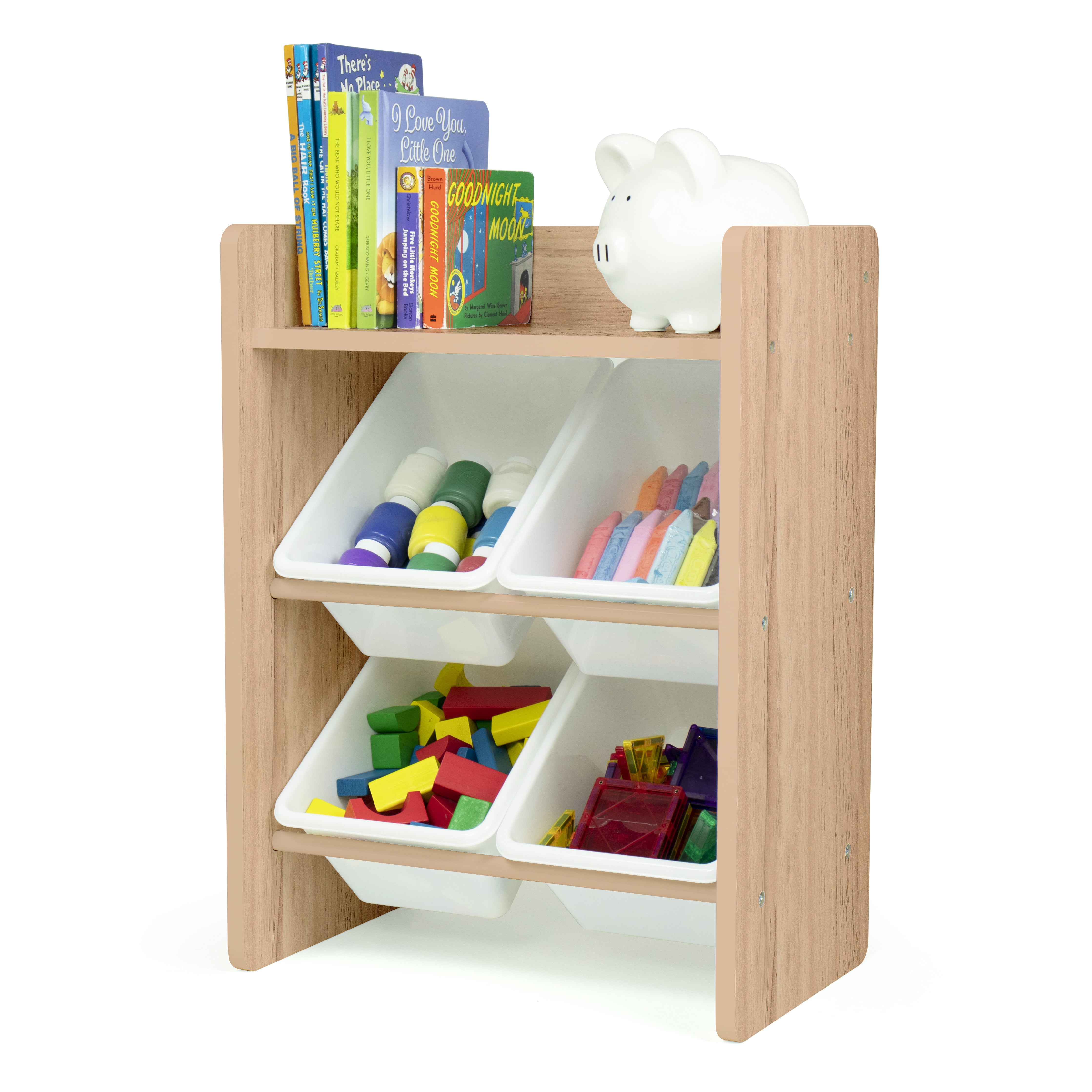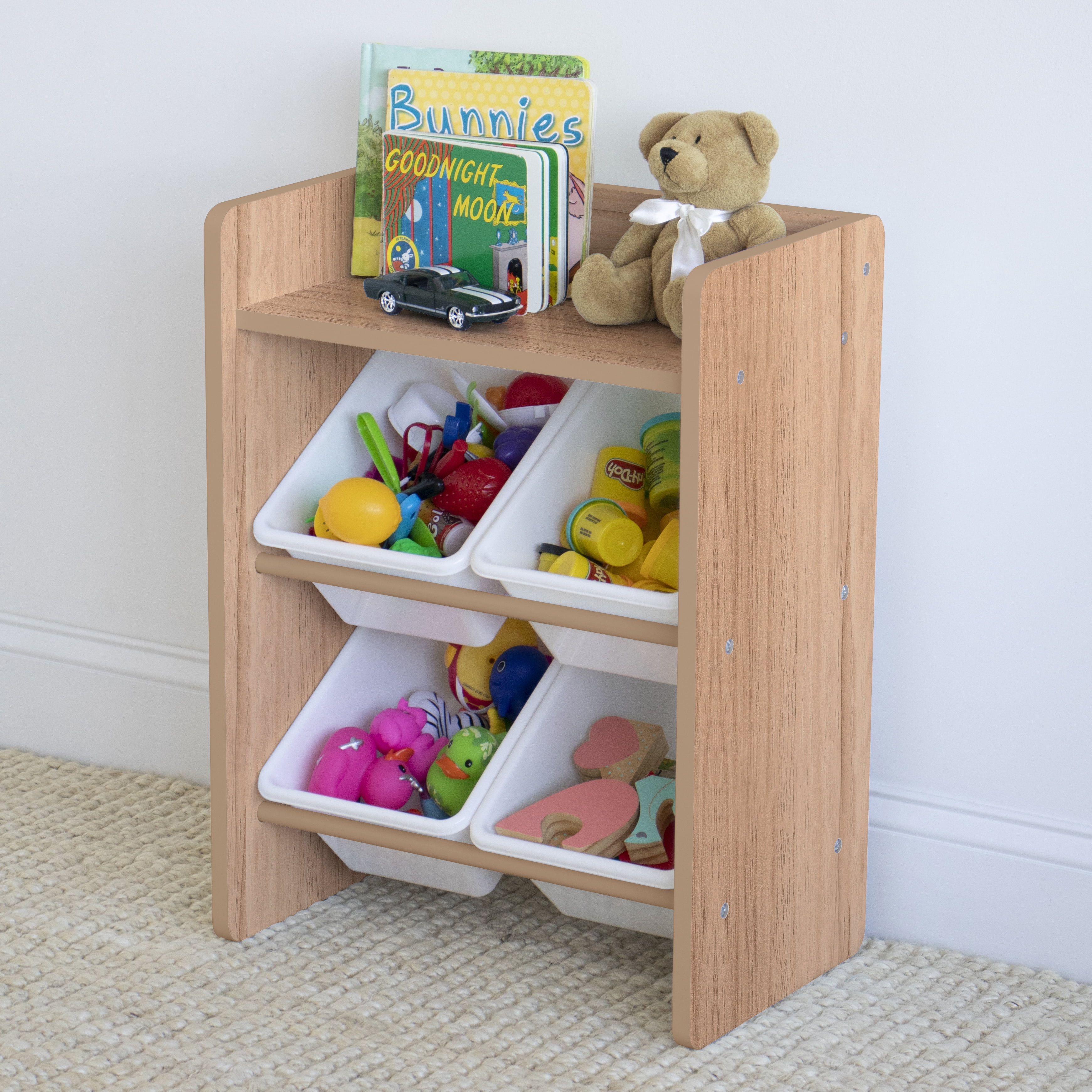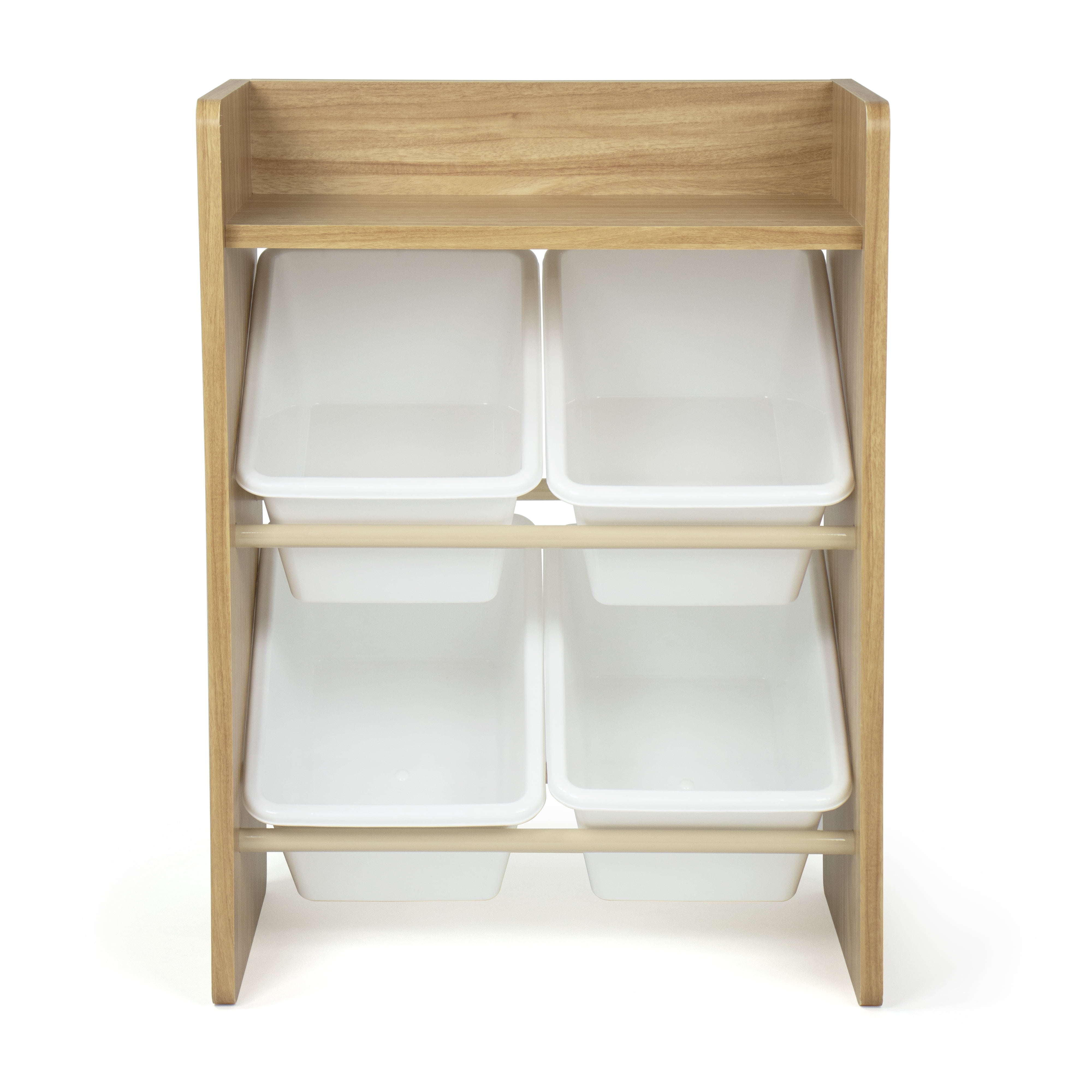 4 standard storage containers are easy to remove, replace and reposition along the 2-tiered organizer shelves. Storage bins are sized just right within the organizer for toddlers, children, and adults of all ages. The top shelf is the perfect size for books, pictures, toys and decorative treasures. Sturdy engineered wood construction frame with stabilizing braces and steel shelving rods, 20-pound weight capacity per level. Some assembly is required. A great toy storage box alternative. Perfect organizational solution for dorm rooms, small space living, bedrooms, playrooms and bathrooms.