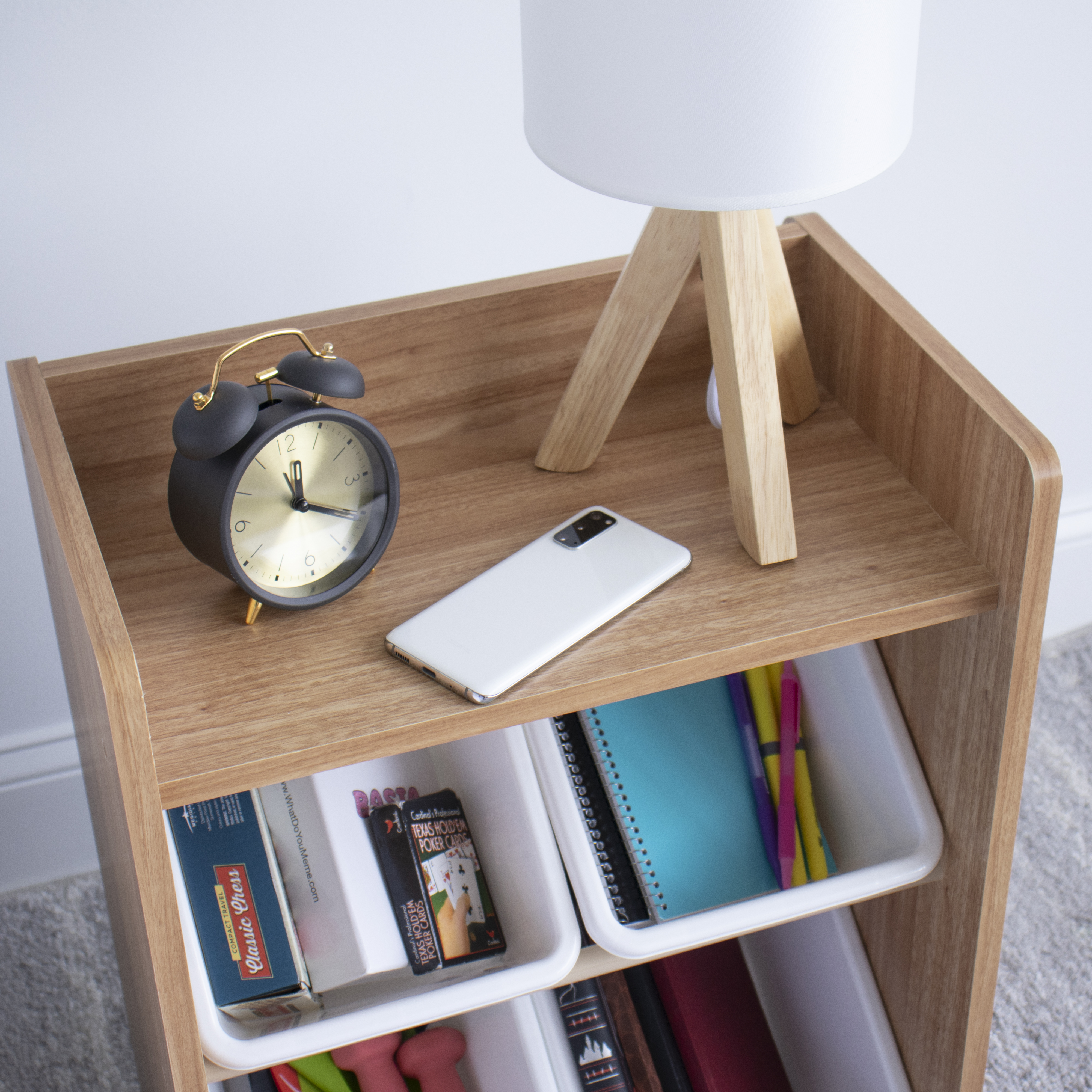 - Neutral wooden finish with white colored storage bins and top shelf
