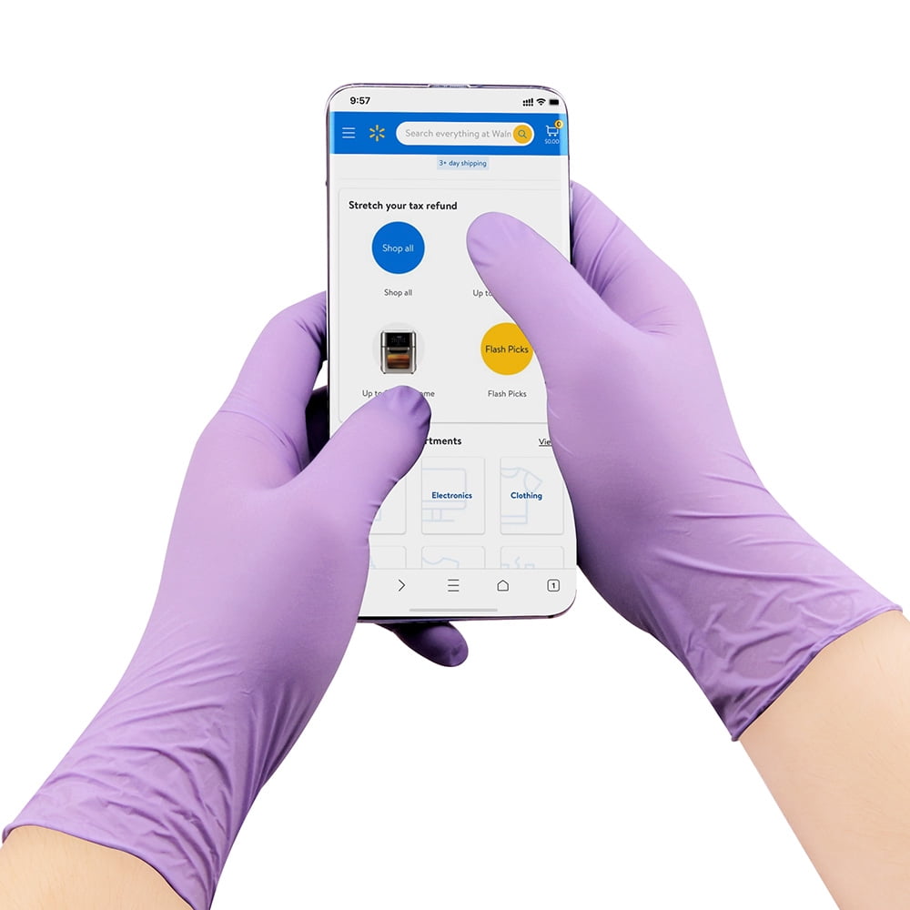 The Nitrile Gloves are ideal for individuals sensitive to natural rubber latex and donning powder,provide a higher level of protection against liquids,gases,sharp objects.Provide optimal protection for your health. The Nitrile Gloves are more flexible and elastic,better fit the hand shape.Easy to put on and take off with fast removal even in wet conditions.4 Mil thickness material provides extra tear and puncture resistance.Smooth finish with textured fingertips and beaded cuff for superior grip and texture in wet or dry conditions.The Nitrile Gloves even can be used with many touchscreen phones and devices.Designed for household cleaning,gardening,kitchen,lab work,painters,hair coloring specialists,pet care,tatoo,etc.