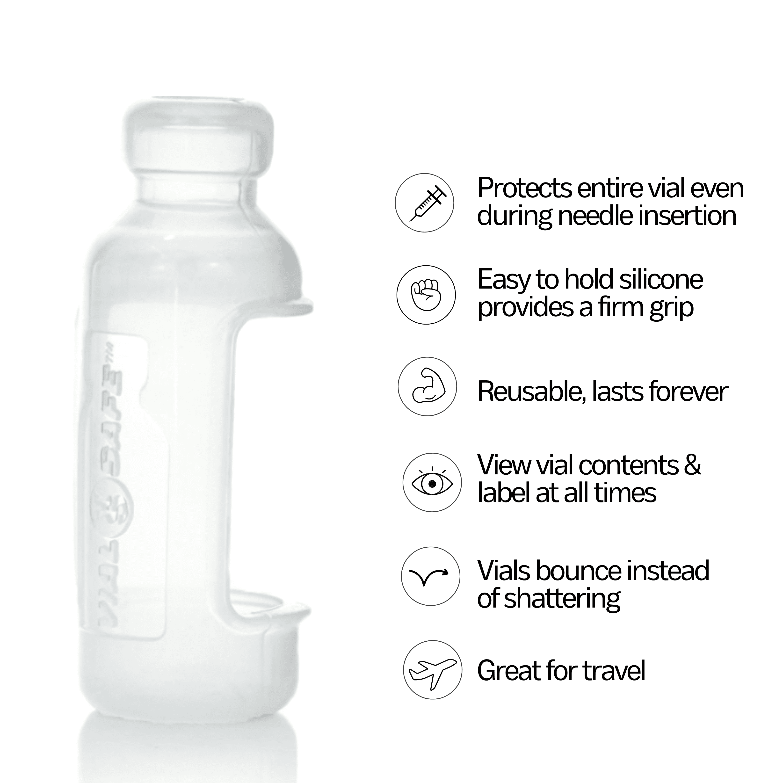 Never worry about broken insulin bottles again! Vial Safe is a super-durable, hypo-allergenic, reusable silicone protective sleeve that provides a secure grip and protects your insulin vials against accidental drops. This TALL size Vial Safe is designed to perfectly fit 10mL vials of LANTUS, APIDRA or ADMELOG.