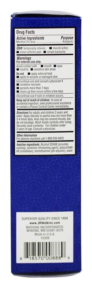 J.R. Watkins Deep Muscle Cooling Gel soothes and cools aches and pains to provide muscles with temporary pain relief. Formulated with time-tested natural menthol, this cooling gel works to deeply penetrate muscles and joints to relieve any pain or soreness resulting from arthritis, muscle strains, and discomfort resulting from overexertion from workouts. Our topical gel uses 97% natural ingredients that are gentle, yet effective for cooling relief. Application is easy, liberally apply to painful areas not more than 3-4 times daily. Keep in your car, purse, or gym bag for fast relief on the go! At J.R. Watkins we aspire to set your body & spirit right with our line of products made with natural ingredients that have stood the test of time for 150 years.