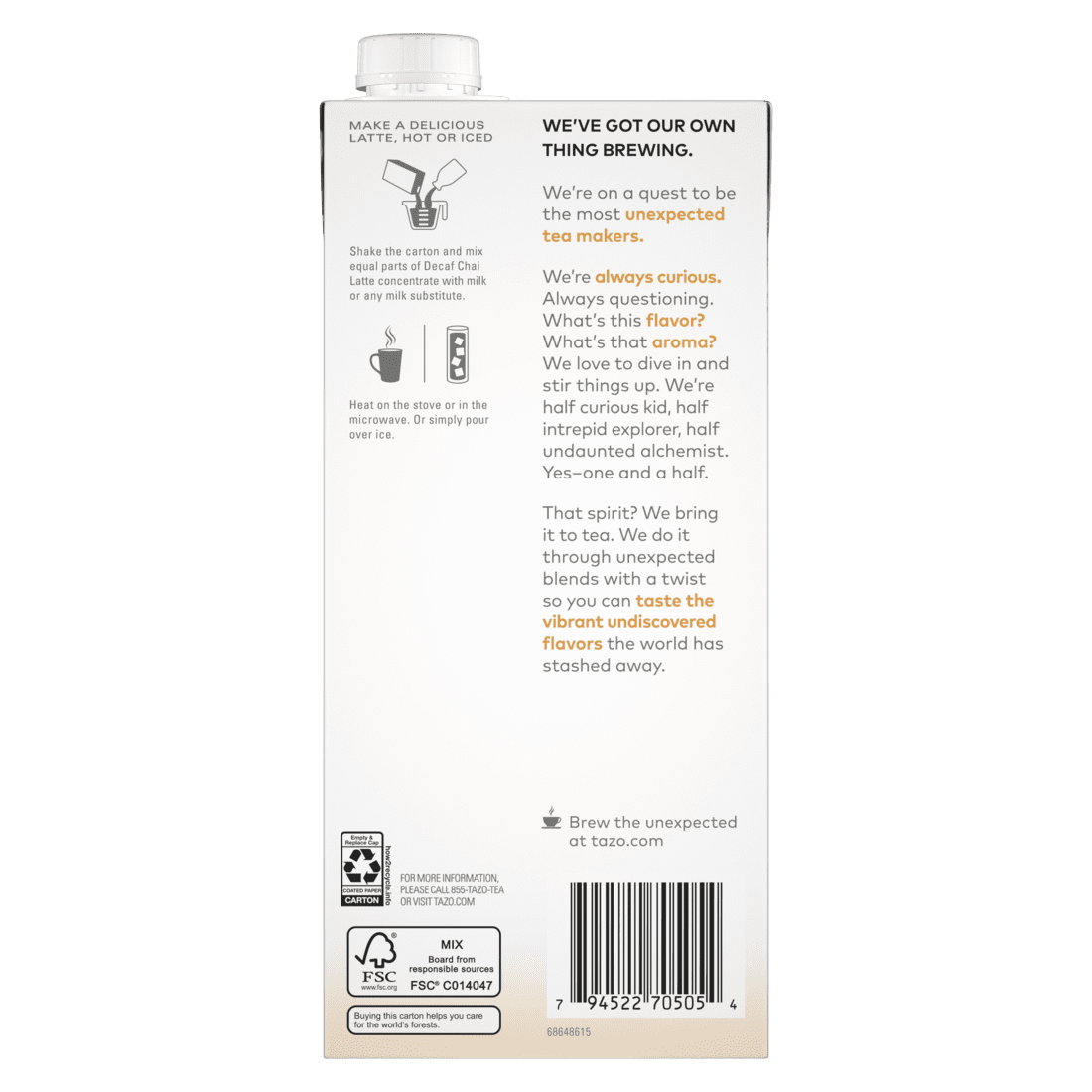TAZO Chai Latte Iced Tea Concentrate, Black Tea, Decaffeinated, 32 oz Carton