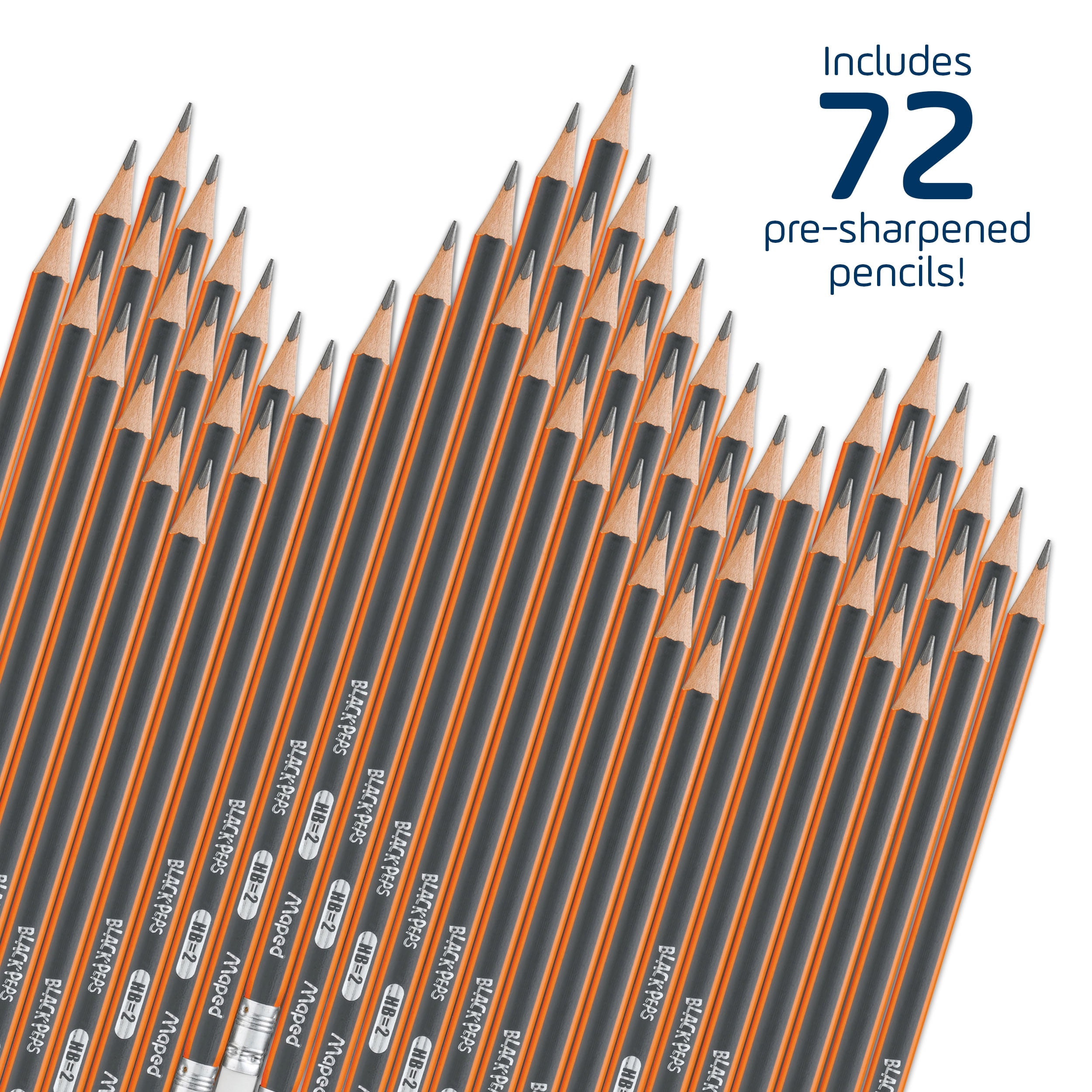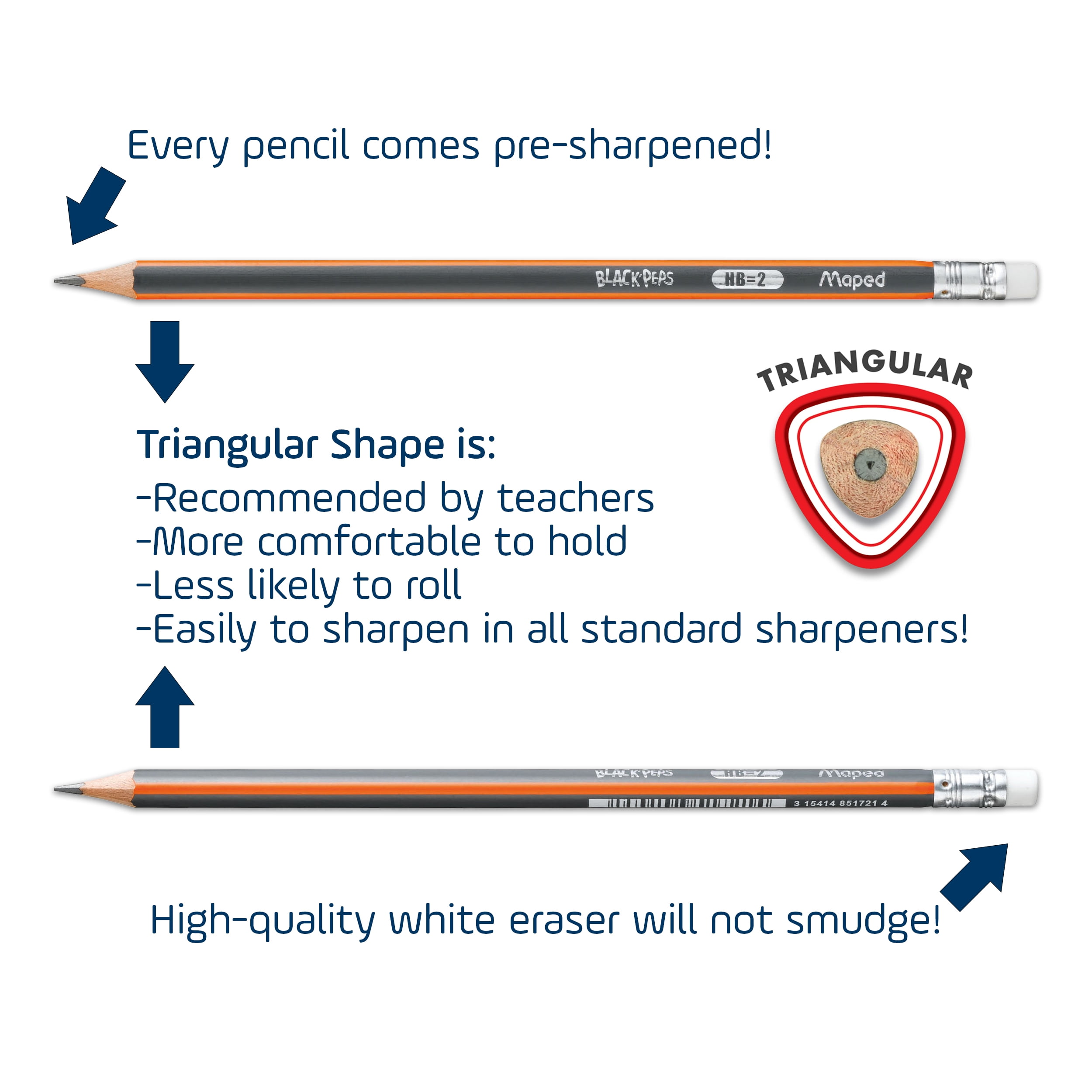 Write more comfortably with Maped Pre-Sharpened Triangular Graphite #2 Pencils! Unlike a standard hexagonal pencil, the triangular body of the Maped pencils naturally index your fingers in the correct spots for a more comfortable hold, and they will not roll off of a desk or table! Triangular pencils are also recommended most by teachers because of their comfort and because they help reinforce a correct pencil grip. High quality #2 / HB graphite is break-resistant and fully bonded to the wood casing so it sharpens in any standard pencil sharpener with no splinters or separated lead. Perfect for writing, drawing, doodling note-taking and more, the unique striped matte finish on the pencil makes it easy to grip and hold. And the premium Latex, PVC and Phthalate free eraser to cleanly removes graphite without smearing or tearing! 72 Count pencils come packed in a reusable pot for easy storage and transport.