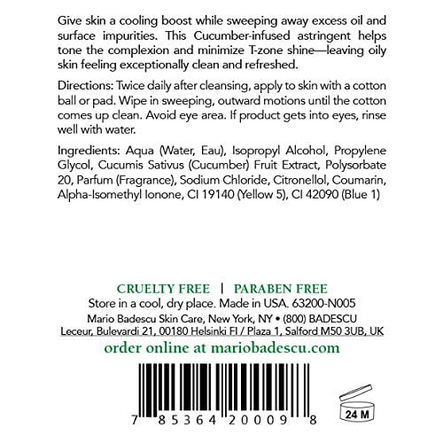 Cucumber Cleansing Lotion 8 oz (236 ml) C, O skin types. Established 1967. A cooling, cleansing astringent for normal, to oily skin. Disinfects and removes residue, oil and bacteria from skin’s surface to prevent breakouts. Twice daily after cleansing, apply to a cotton ball/pad and wipe skin in an outward direction repeating until cotton comes up clean. Follow with moisturizer, avoid eye area. 8 oz (236 ml) 320 East 52nd Street New York, NY 10022 800-BADESCU