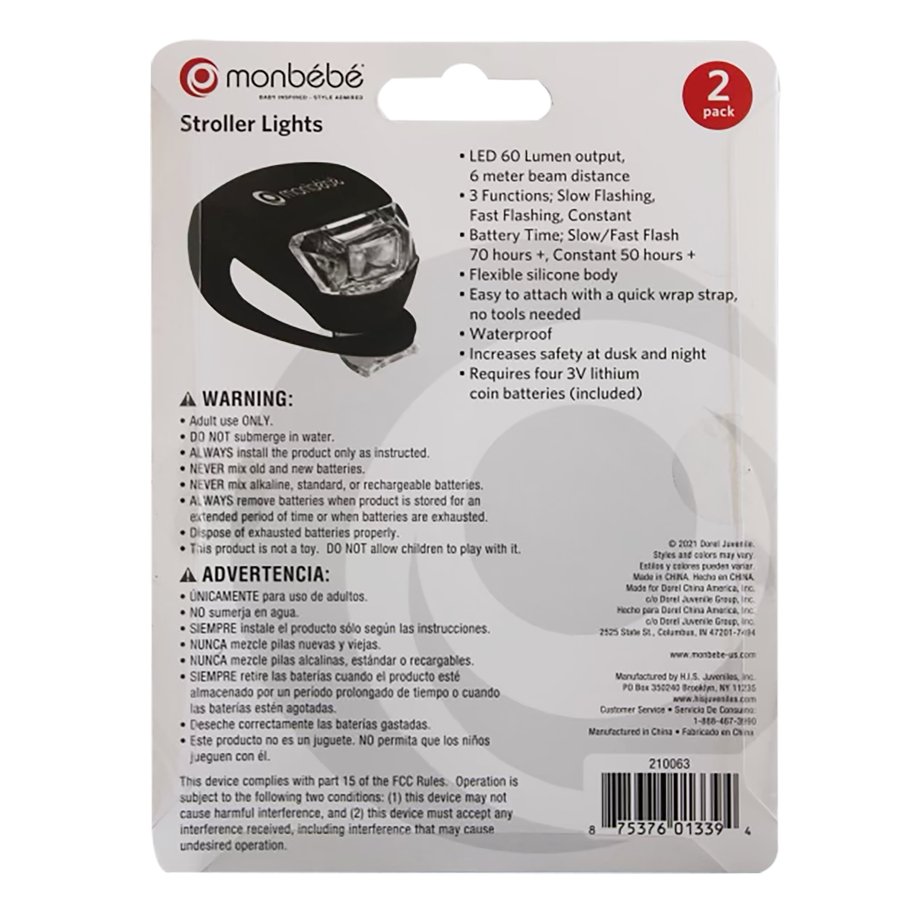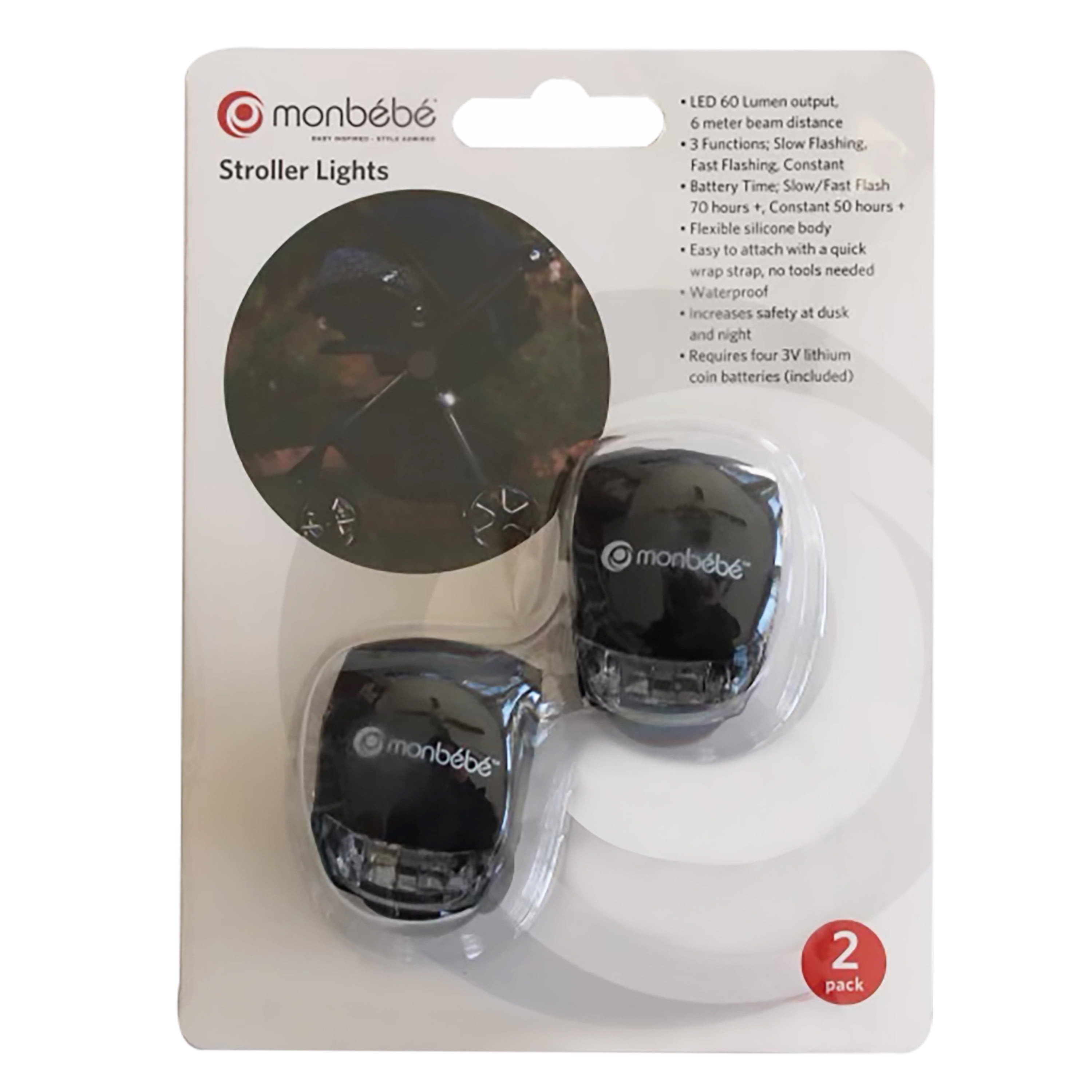 Includes two lights, one for each side of the stroller. Customize to steady constant lights, slow flashing lights or rapid flashing lights.