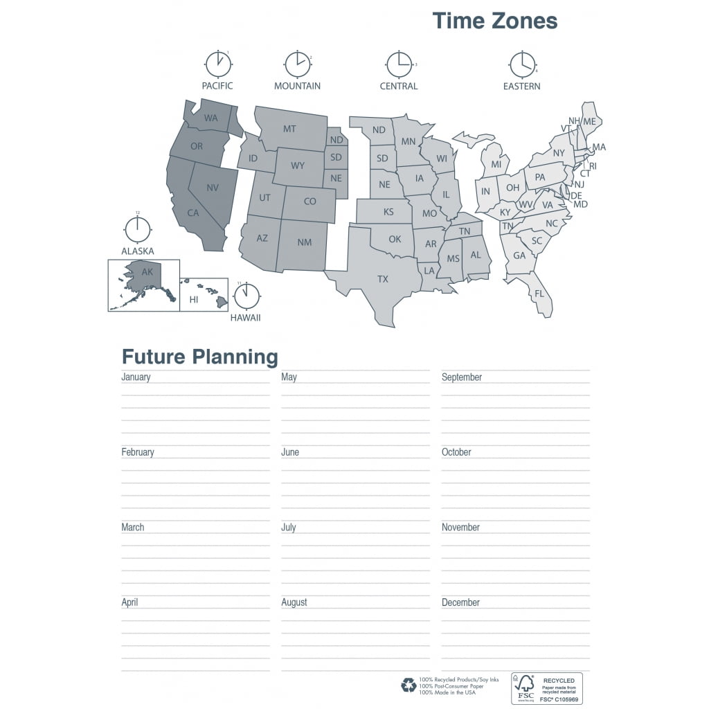 This classic monthly planner has ample space in the daily blocks for appointments and reminders. July-August featuring 14 months for easy planning. Full monthly view per two-page spread, featuring 2-1/8" x 1-7/8" blocks allocated for each day. Previous and next month reference on each two-page spread. Additional page with important holiday dates for 3 years in list form. Three-year calendar reference page for long-range planning. Note space for future planning per month to keep you organized. Julian dates and days remaining for quick reference. The cover features a black embossed simulated leather finish. Strong wire binding firmly keeps the planner intact throughout the year. Includes a double-sided storage pocket. Printed on 100% post-consumer recycled FSC certified paper with soy inks. . Measures: 8-1/2" x 11".