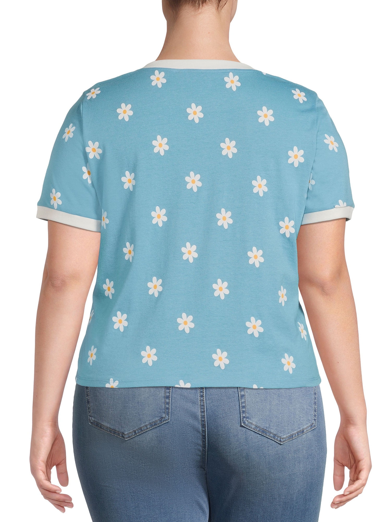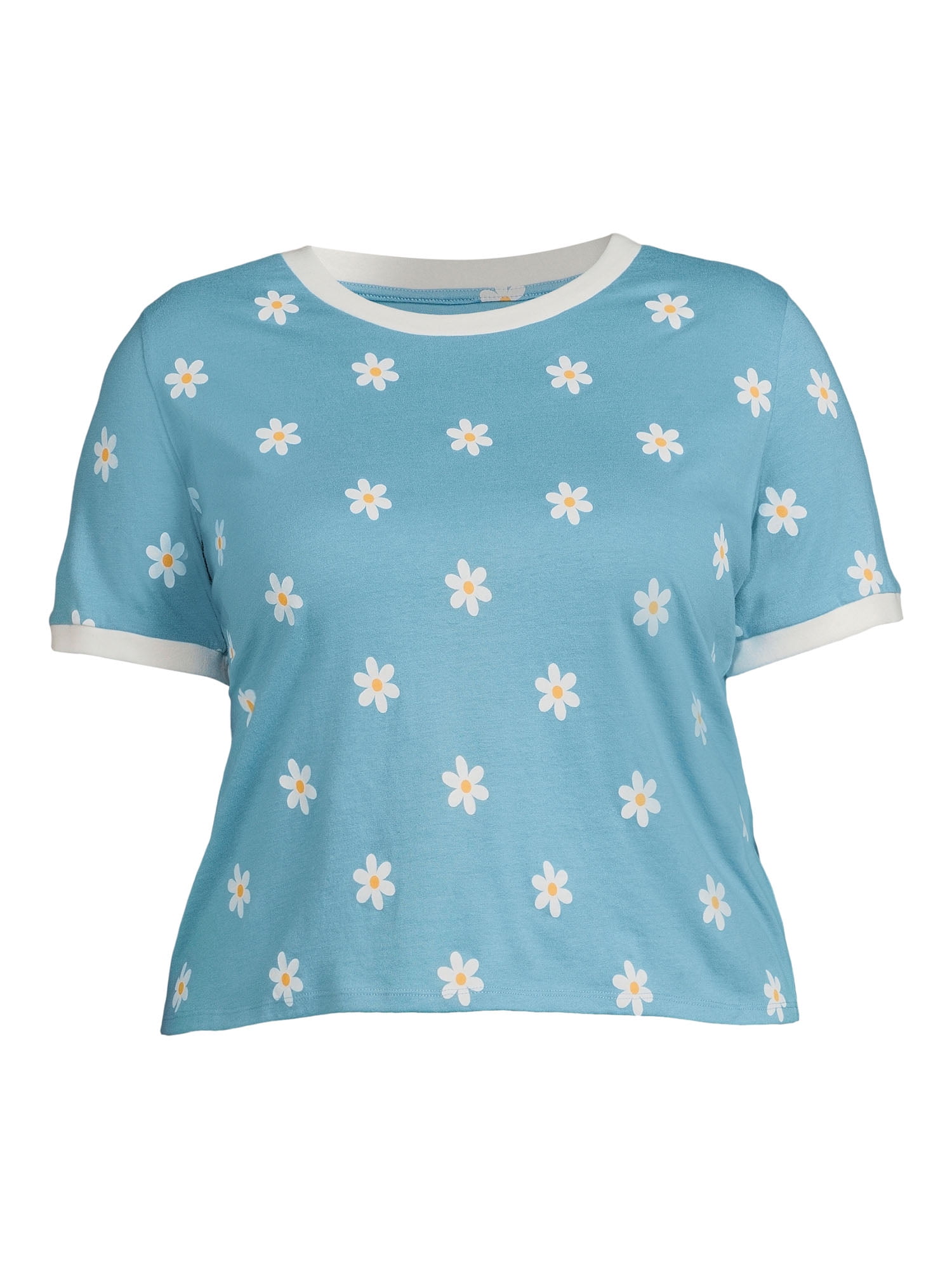 A fun addition to your wardrobe with No Boundaries’ Ringer Tee. The boxy silhouette is a perfect match for high-waisted shorts – just add your favorite kicks when the weather is warm, and the dress code is casual. A playful print lends extra style to this must-have tee. Exclusively at Walmart.