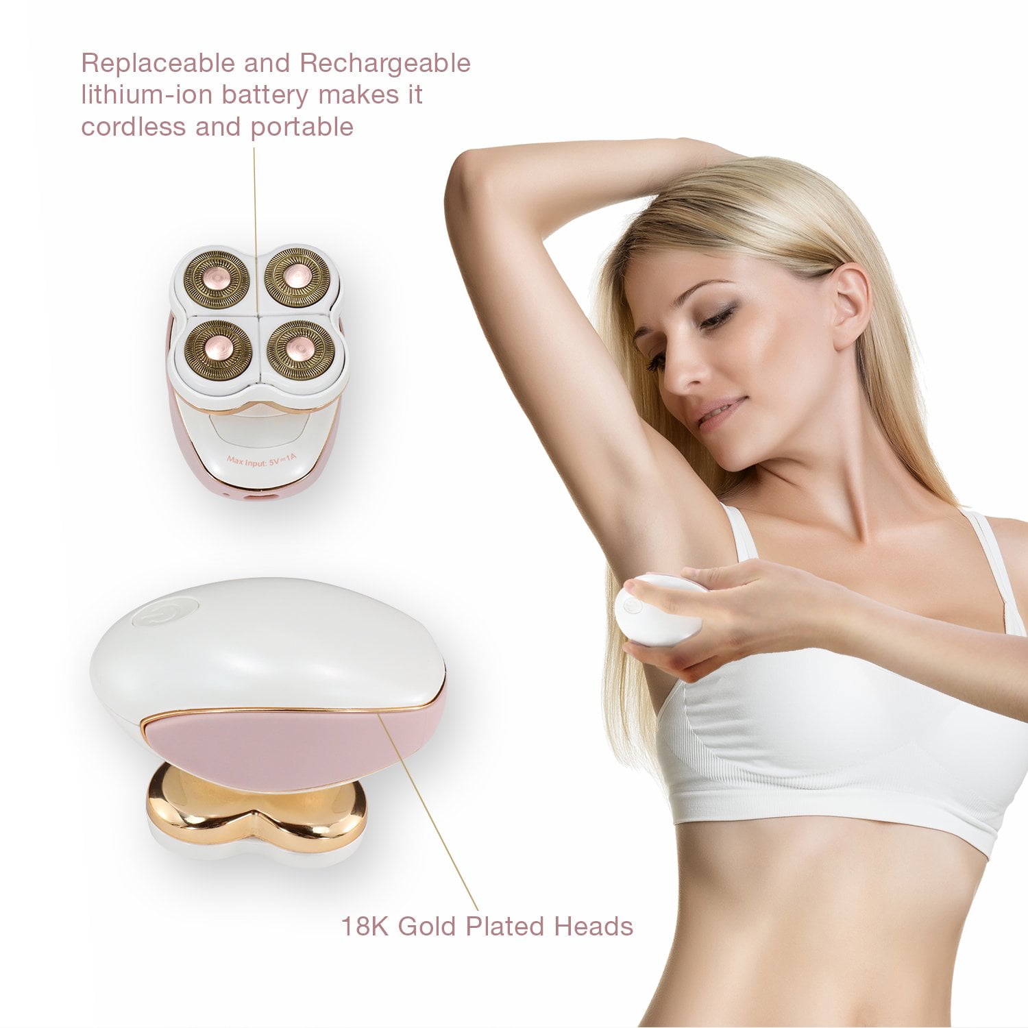 - SUPREME SHAVER : High quality multi-functional leg hair shaver with ergonomic design. Featuring 4 interchangeable 18K gold plated heads which follows the natural contours of the skin to closely remove unwanted hair everywhere you wanted.