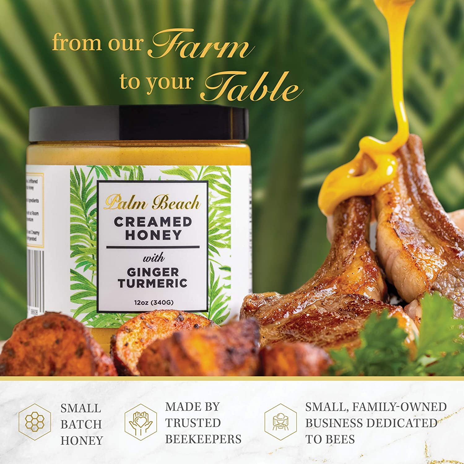 Palm Beach Creamed Honey with Ginger and Turmeric is raw, American honey made from ethical and responsible sources straight from Florida. Our honey consists of natural enzymes and bee pollen; it has many great properties. This spreadable honey has a silky, smooth, thick, rich, and creamy texture. When it is left in the fridge, it develops a rich and creamy thickness. Our honey has an Extended shelf life! Since our honey has antimicrobial properties and is made with natural and organic ingredients, this creamed honey can last for years on your shelf—even when kept at room temperature! Product Net Content Quantity: 12 Ounces