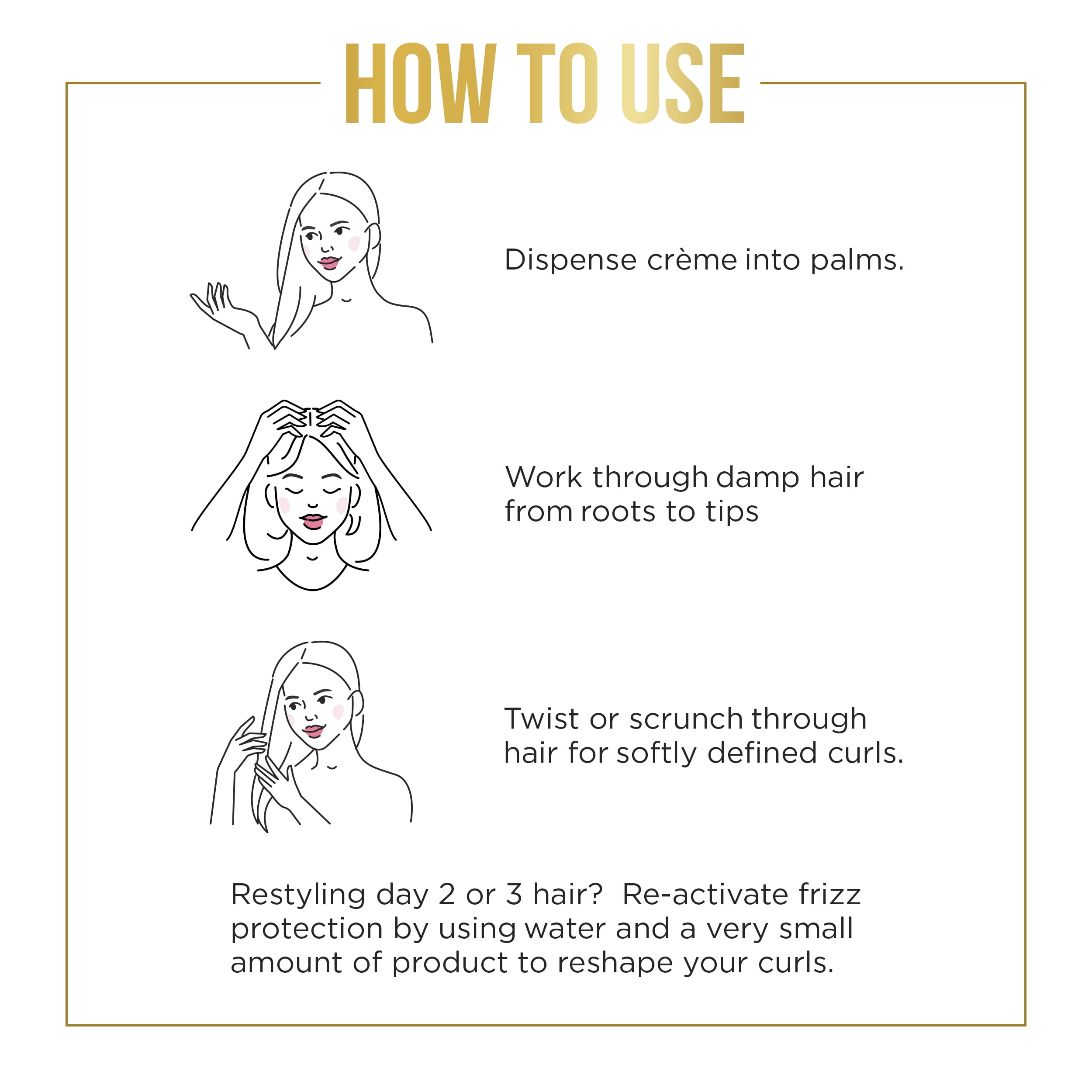 Dispense crème into palms and work through damp hair from roots to tips. Twist or scrunch through hair for softly defined curls. On day 2 or 3, restyle your hair without washing by spritzing your curls with water and applying a very small amount of product to achieve frizz protection and reshape your curls without buildup.
