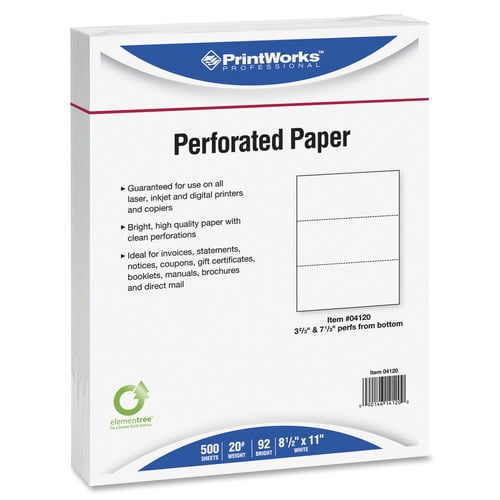 Horizontally perforated paper delivers consistent results to create high-quality prints and is compatible with business and accounting software. Letter-size paper is designed for use with all laser printers, inkjet printers, digital printers and copiers. Multipurpose design is perfect for printing invoices, billing statements, patient charts and more. Paper is perforated 3-2/3" and 7-1/3" from the bottom.