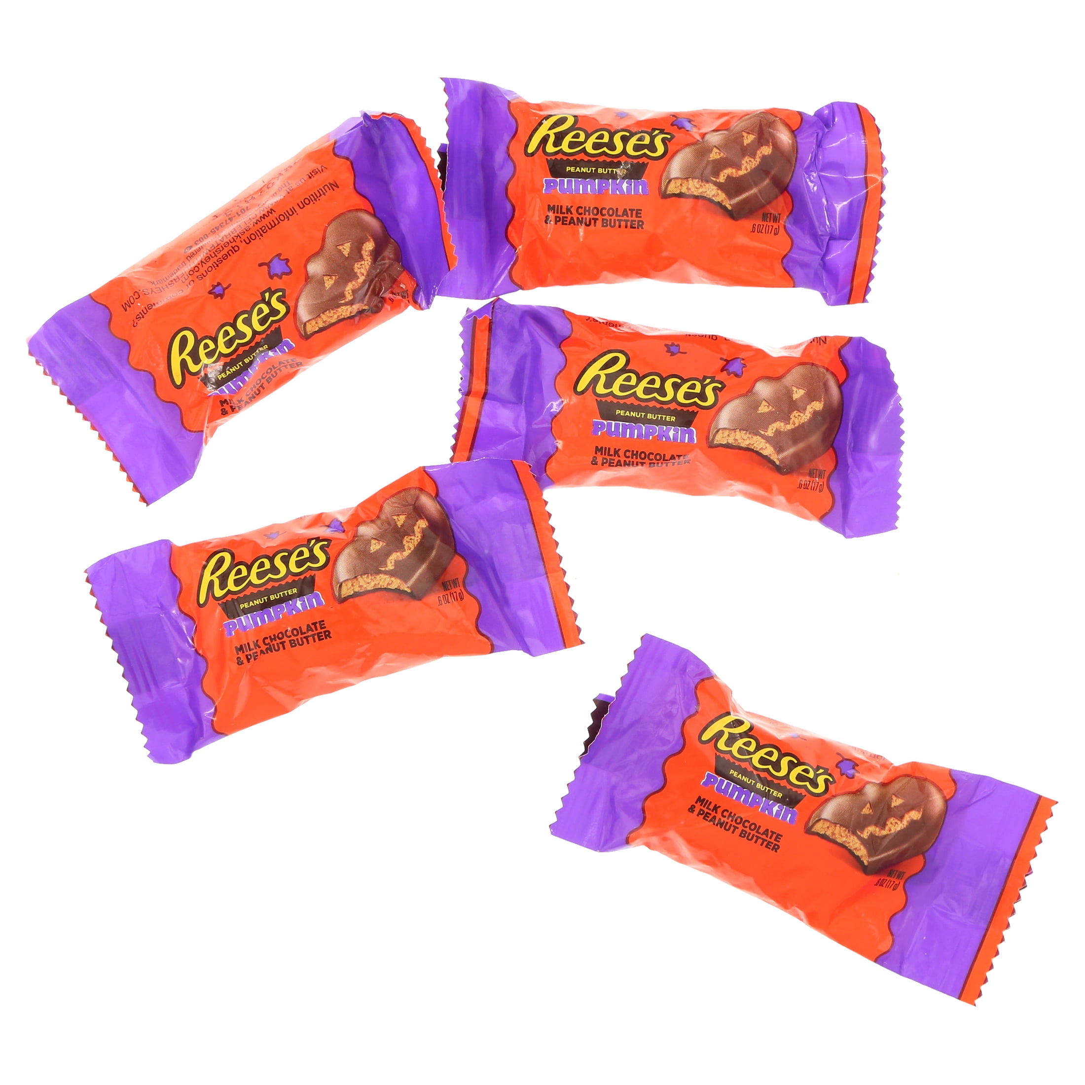 - Bulk bag of individually wrapped and kosher peanut butter pumpkin-shaped REESE’S candies in a jumbo bag
