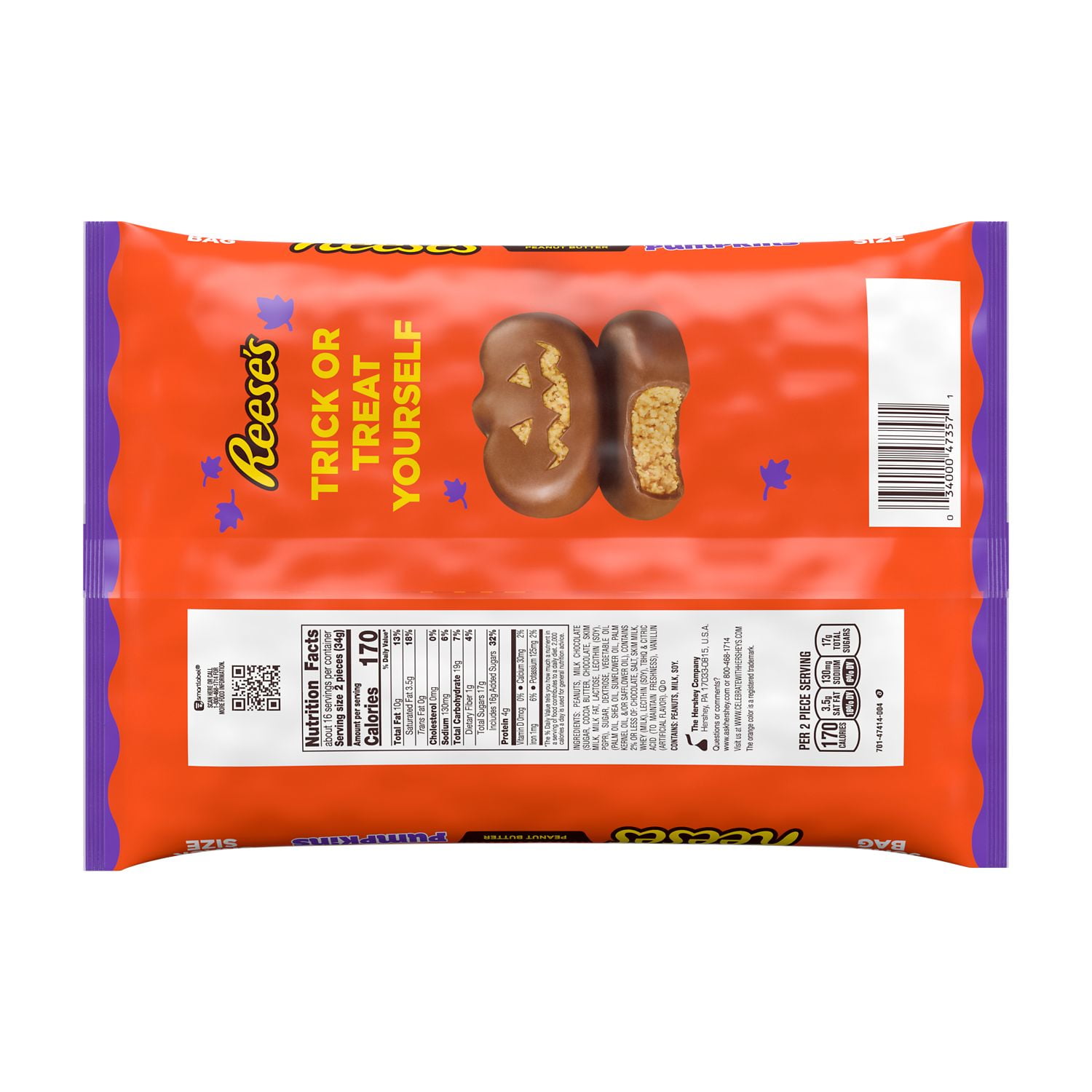 - Contains one (1) 19.2-ounce jumbo bag of REESE’S Peanut Butter Chocolate Snack-Size Pumpkins