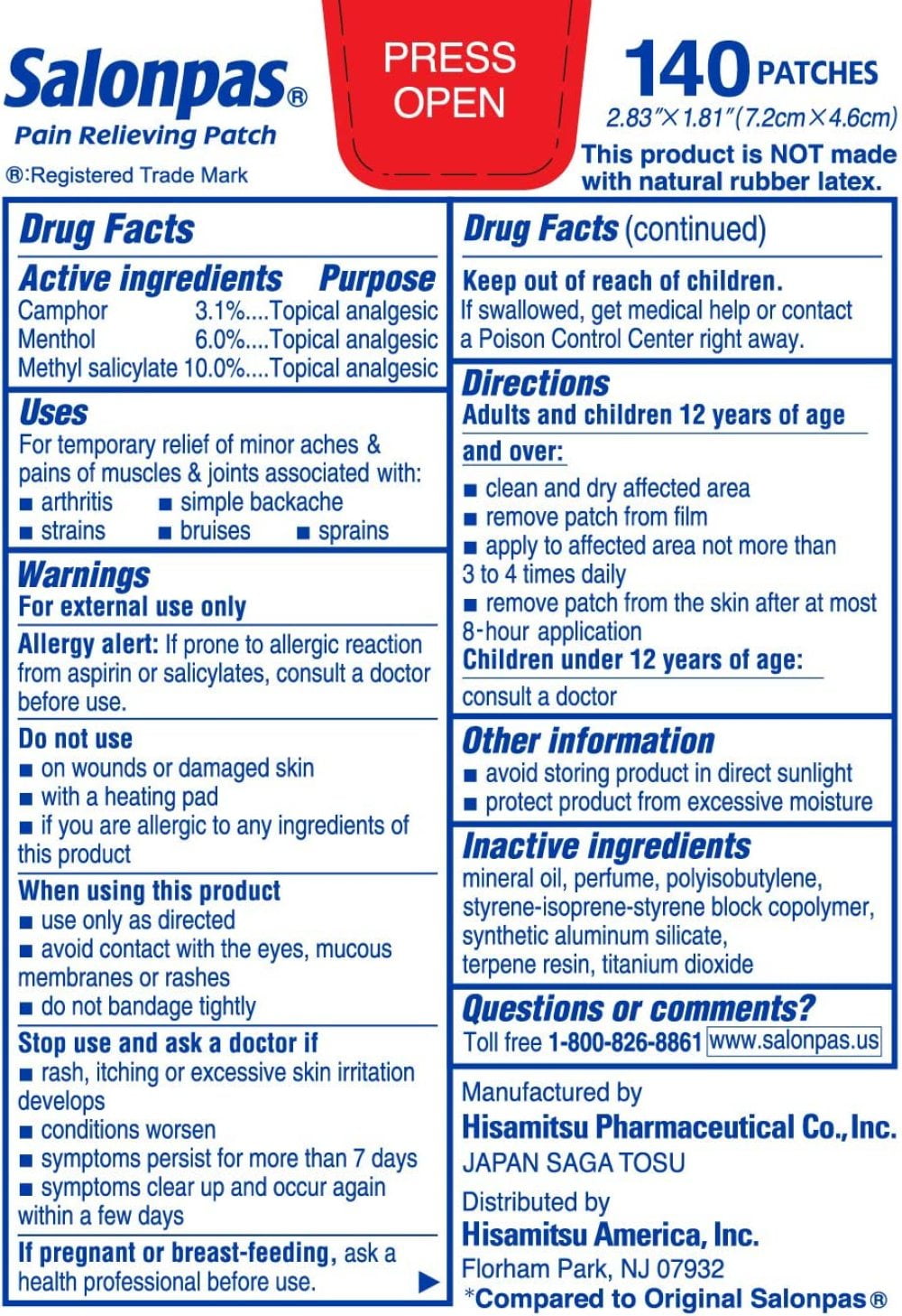 From the World’s No. 1 OTC Topical Analgesics Patch Brand1 Maximum strength available without a prescription Soothing hydrogel technology Unscented, numbing relief to desensitize aggravated nerves Rounded corners help prevent accidental peeling of the patch providing better adhesion2 throughout use. A clever mid-line perforation in the backing makes it easy to apply without wrinkles or folding. Thin, flexible and stretchable material bends with your movements to remain affixed to your skin. One patch per pouch means your patch will be fresh each time. Smart packaging design provides peace of mind for parents and caregivers. Salonpas® is the World’s No.1 OTC Topical Analgesics Patch Brand1 . With 80 years of experience in topical analgesics, Salonpas provides innovative and effective over-the-counter products to millions of pain sufferers around the world. Topical anesthetic patches, like Salonpas® LIDOCAINE 4% Pain Relieving Gel-Patches, are a great alternative to gels or creams. Patches are portable, convenient and apply without any mess. When applied properly, Salonpas patches stay in place and can be worn easily under clothing. Try Salonpas® LIDOCAINE 4% Pain Relieving Gel-Patches the next time you have pain. Active Ingredient: Lidocaine 4% – Topical Anesthetic Directions: Adults and children 12 years of age and over: -Clean and dry affected area -Remove film from patch and apply to the skin (see illustration) -Apply 1 patch at a time to affected area, not more than 3 to 4 times daily -Remove patch from the skin after at most 8-hour application Children under 12 years of age: -Consult a doctorOver-the-Counter Medicines