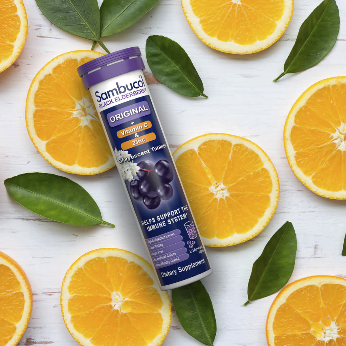 Transform your water into a delicious, fizzy treat and support your immune system while you hydrate!* Sambucol Black Elderberry Effervescent Tablets provide powerful immune support from premium European Haschberg Black Elderberries (Sambucus nigra) plus Vitamin C and Zinc.* They’re easy to take with you on the go – whether you’re at the office, the gym, or catching a flight. Our effervescent tablets dissolve quickly in water for a refreshing, bubbly way to support a healthy immune system.* Sambucol is The Original Elderberry brand, trusted by millions worldwide. Discover the difference with Sambucol and the Power of Advanced Immune Support.*