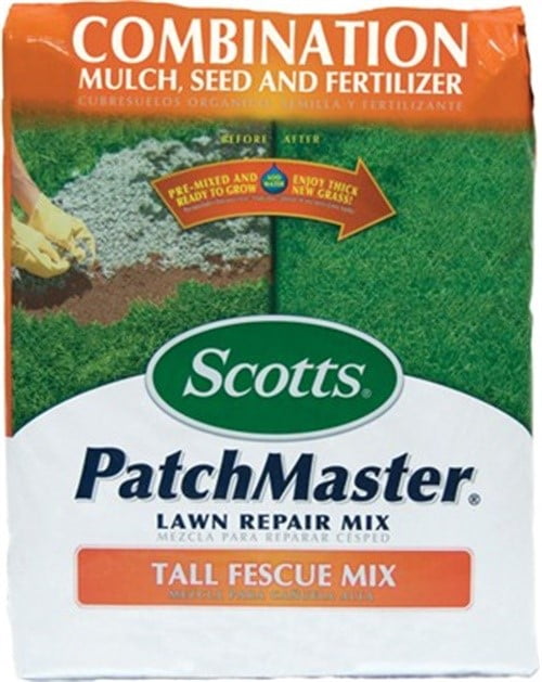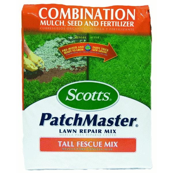 Scotts PatchMaster Tall Fescue Grass Patch & RepairCombination of tall fescue grass seed, starter fertilizer, and starter mulch. All-in-one product includes everything needed to repair bare spots. Blend with existing tall fescue lawns. Germinates in about 7 days. 4.75 lb bag covers up to 115 sq ft.