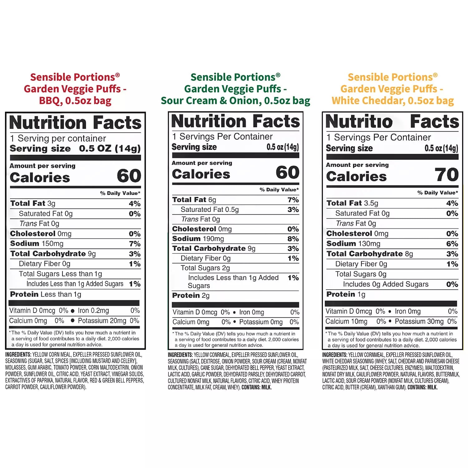 Sensible Portions Garden Veggie Puffs are poppable snacks with a delicious taste the whole family can enjoy, even the kids at heart. Baked, never fried and with 30% less fat than the leading puffed snack, these puffs can cure your crunchy cravings anytime. Each pack offers three delicious flavors of Garden Veggie Puffs to choose from: Sour Cream and Onion, White Cheddar, and Barbecue.Sensible Portions Garden Veggie Puffs Variety Pack, 0.5 Ounce (Pack of 30)