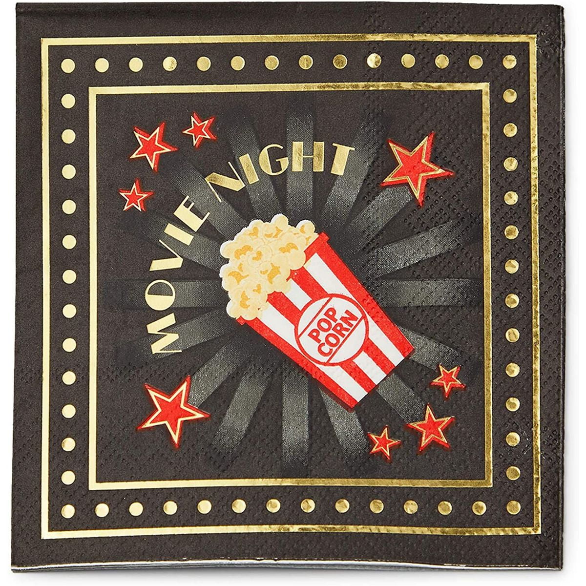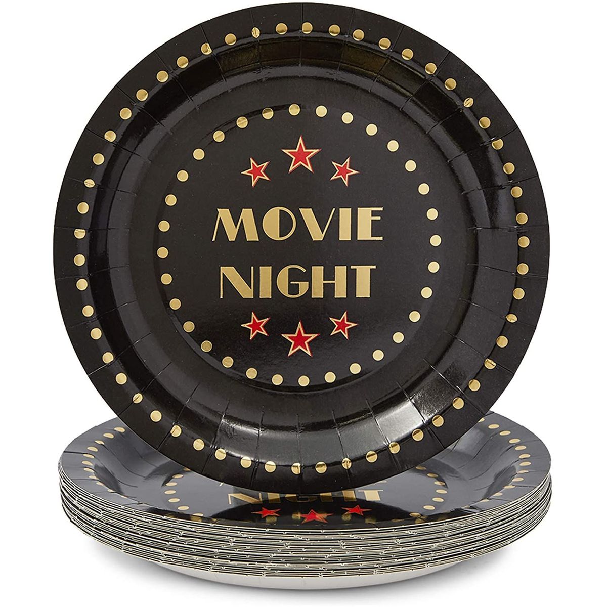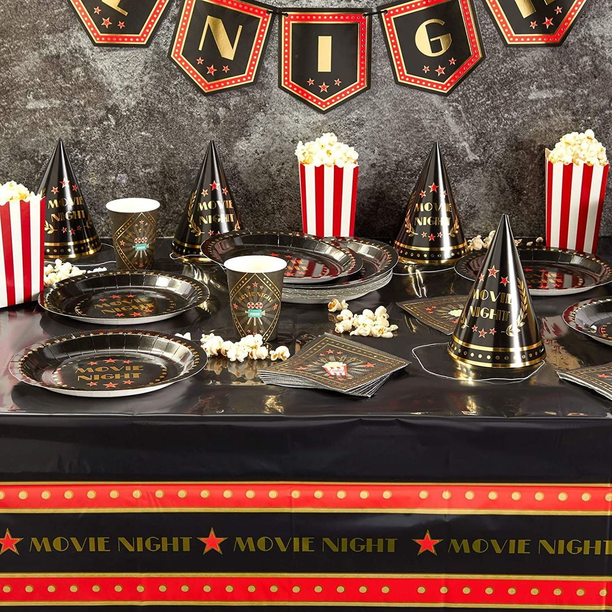 - Serves 24: This movie night dinnerware set includes enough tableware for 24 guests; contains 24 of each of the following: 24 plates, 24 cups, 24 napkins and 24 party hats with 2 table covers and a string banner; 99 pieces total
