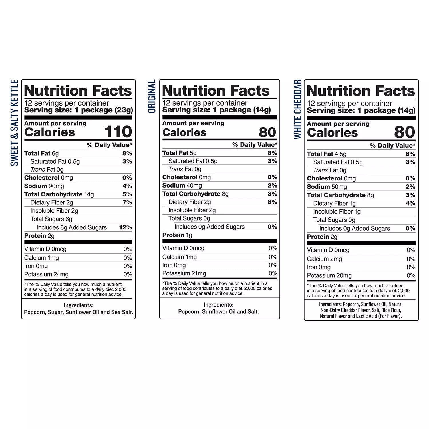 Skinny Pop Popcorn Variety Snack Pack 36 Ct. Skinny Pop Popcorn Variety Snack Pack makes handing out delicious snacks easy. This enormous box is great for carnivals, birthday parties, office break rooms and relaxing evenings with friends. Skinny Pop puts three different flavors of popcorn in this variety pack, including White Cheddar, Original, and Sweet & Salty Kettle. They’re so delicious that you can hand them out to children, teenagers and grown adults, or pack in your own bag for a snack anytime. Popcorn bags, Popcorn bowl, Popcorn salt, Popcorn kernelsBox of SkinnyPop popcorn Good source of fiber Contains zero trans fat Kosher Vegan certified
