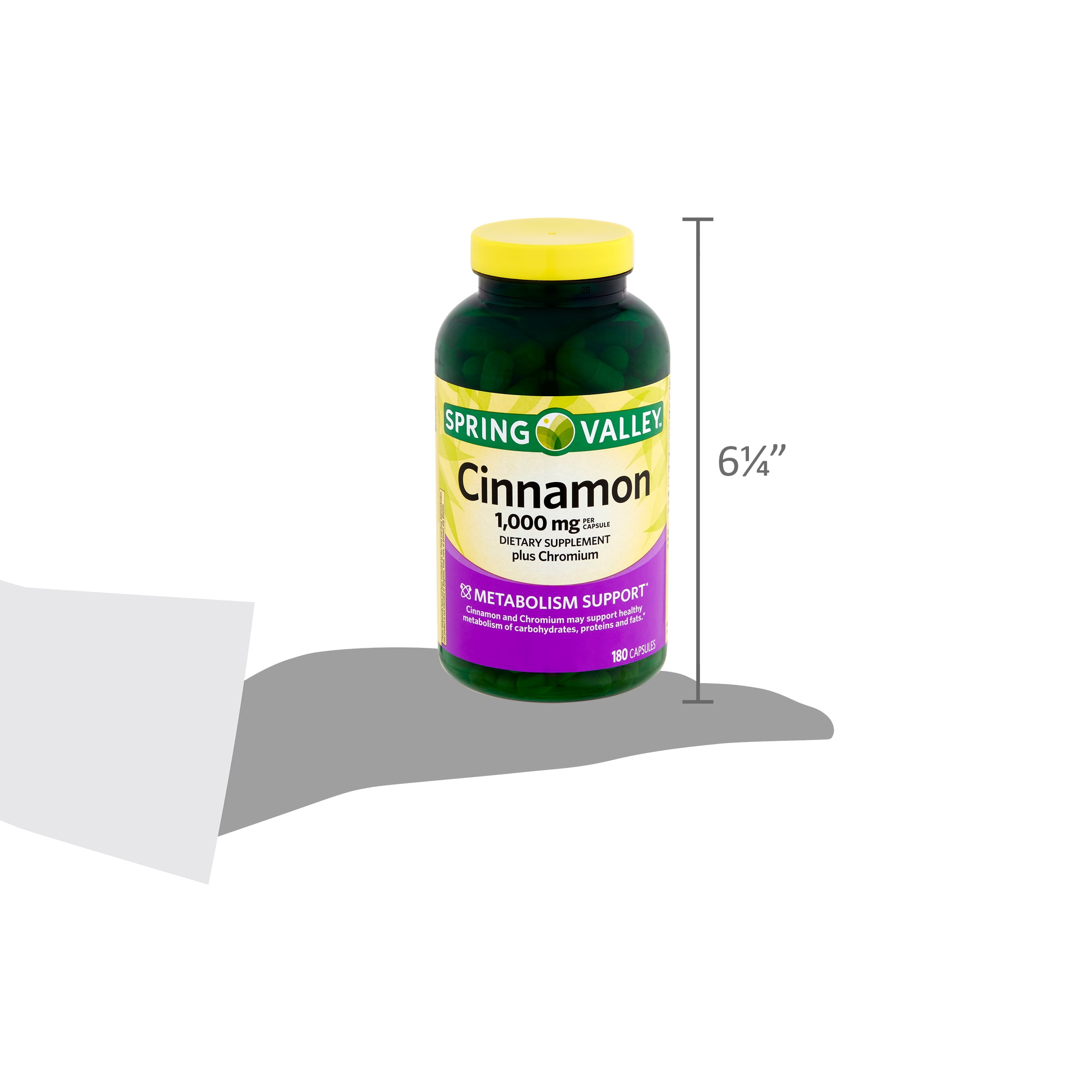 Spring Valley cinnamon plus chromium dietary supplement, 1, 000 mg is a supplement designed for metabolism support. Cinnamon and chromium may support the healthy metabolism of carbohydrates, proteins and fats. The suggested adult dosage is 2 capsules daily, preferably with a meal. These capsules contain no gluten, lactose, artificial colors or artificial flavors.