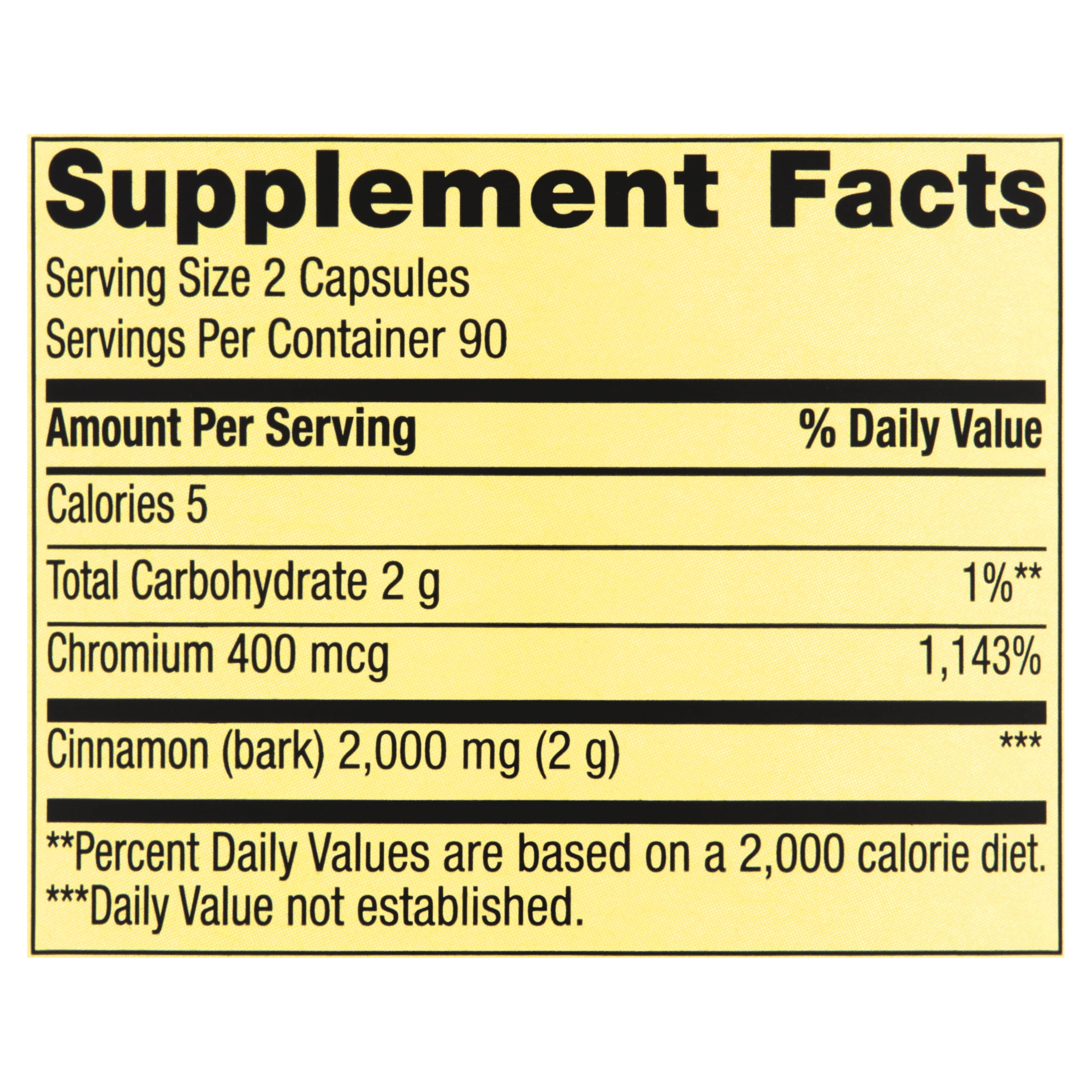 - 1000 mg of cinnamon and 200 mcg of chromium per capsule