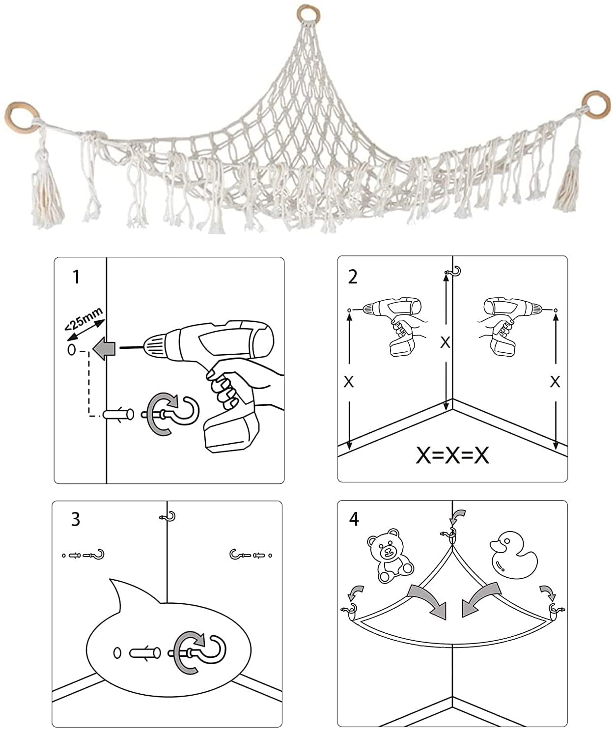 - EASY TO INSTALL: The hanging toy Hammock is easy to mount on the room corner. 3 drill hooks and 3 adhesive hooks are included. Choose the installation method according to your needs.