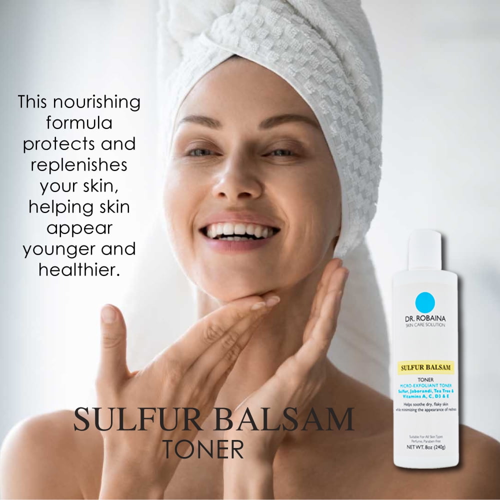 SULFUR BALSAM Toner is a unique formula that contains natural antioxidants. Vitamins A, C, D and E along with Sulfur, Jaborandi, Tea Tree and other natural ingredients that help soothe itchy, flaky, scaly skin associated with psoriasis while minimizing the appearance of redness. PLUS helps to avoid recurrences. This nourishing formula protects and replenishes your skin, helping skin appear younger and healthier. For people prone to Eczema, Psoriasis, Rosacea, Dermatitis, dry itchy skin and other dermatitis. Suitable for sensitive skin. Totally free from steroids, hormones, cortisones, parabens, anti-biotics, perfumes. Not tested on animals.