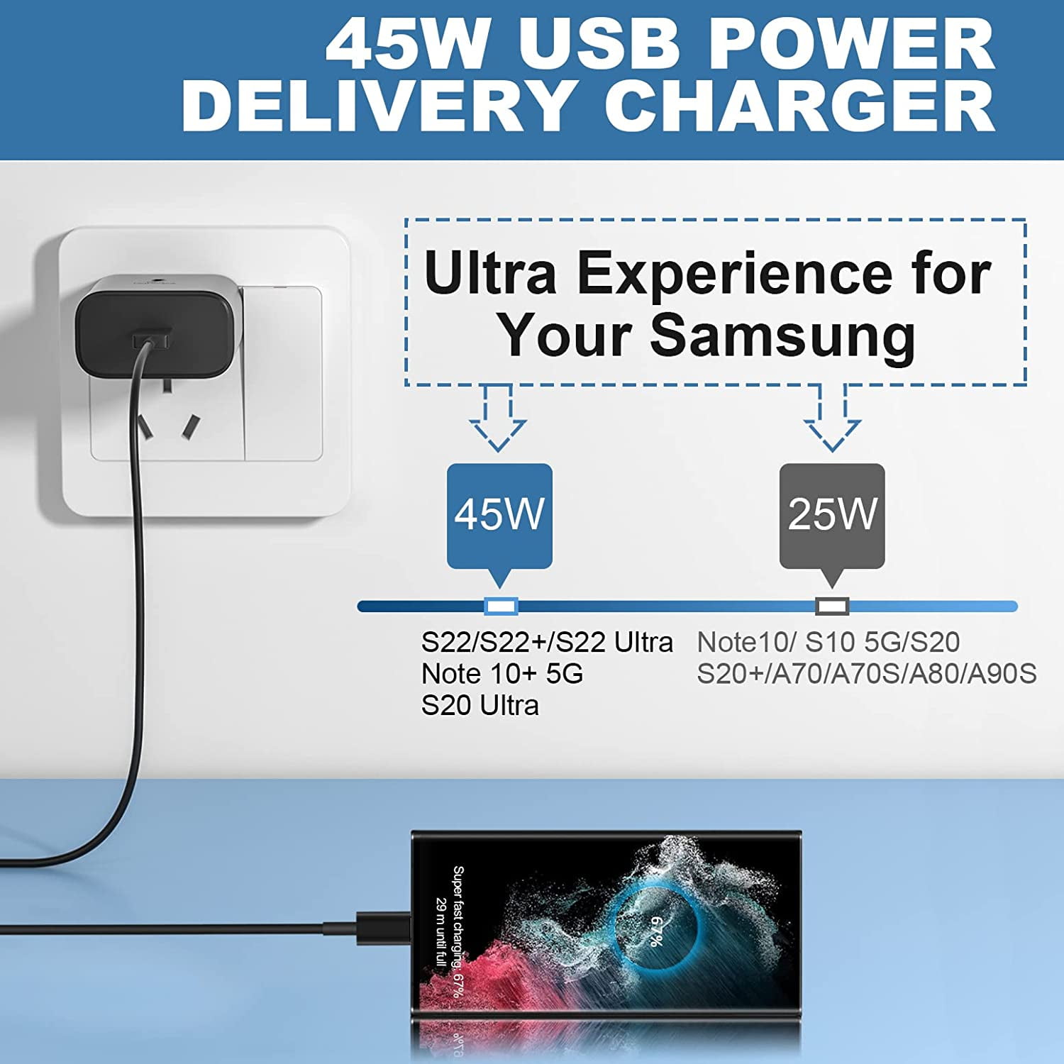 【Super Fast Charging Up to 45W】With USB C PD /PPS(Programmable Power Supply) protocol, it provides 45W Super Fast Charging for Samsung Galaxy S22/ S22 Ultra/ S22+/ S20 Ultra / Note 10 Plus, Galaxy Tab S8 S7 / Tab S8 S7 Plus/ Tab S8 Ultra and it provides 25W Super Fast Charging for Galaxy S21 / S21 Ultra / S21 Plus / Note 20 Ultra / Note 20 / Note 20 Plus / S20 Plus / S20 / Note 10