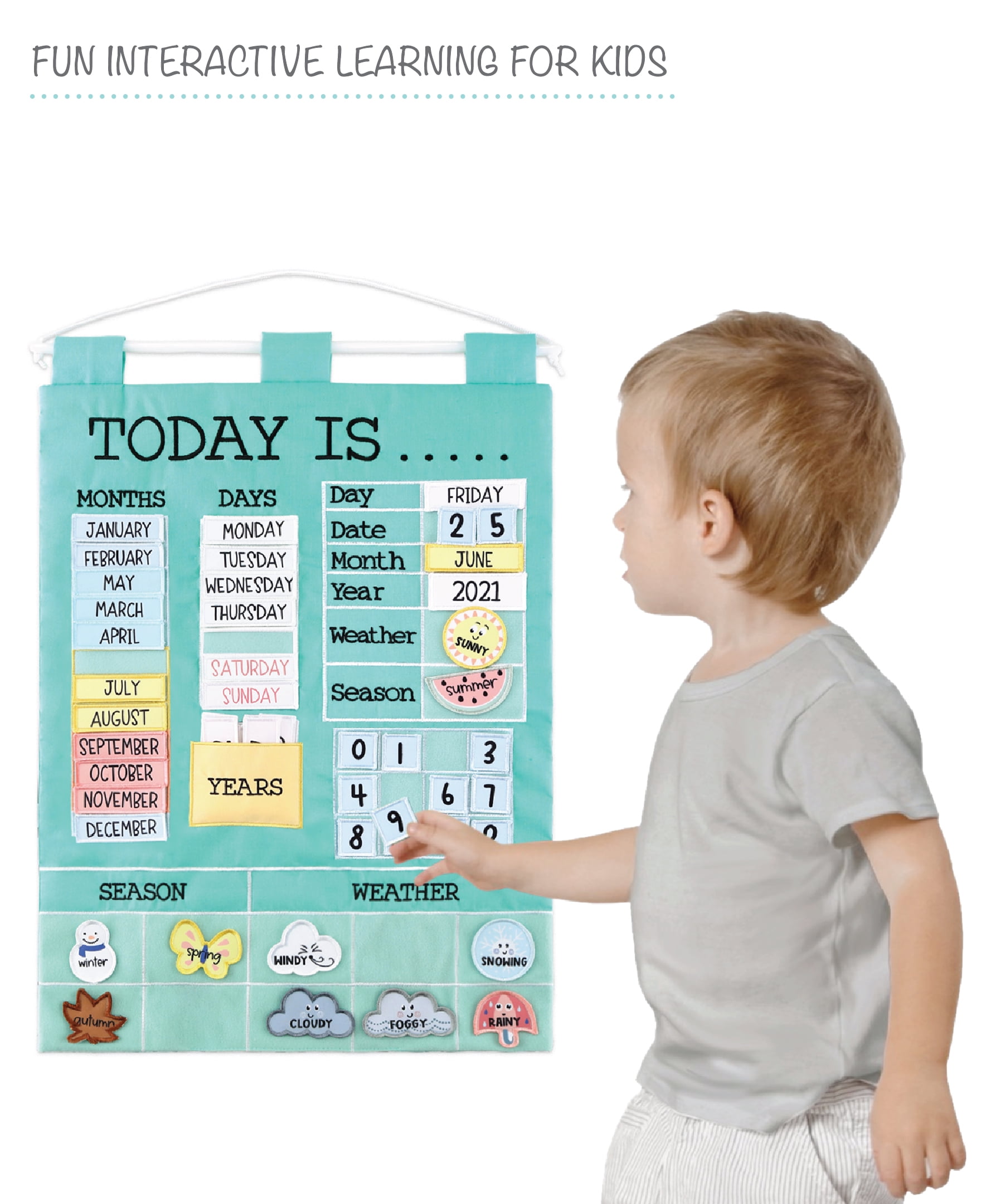 The Peanutshell children’s learning calendar is a fun interative toy and learning tool that encourages recognition and language development. This learning chart prepares children for the day by teaching reading a calendar, the seasons, and weather. Children will build dexterity skills as they play with the small, soft fabric pieces of the chart to describe the day. All fabric pieces are color coordinated between month, year, and season, as well as all 7 days of the week and numbers 0 through 9 with two numbers 1 and 2. The chart also includes 6 different weather types. This learning calendar can be used as a classroom weather chart activity or at home!