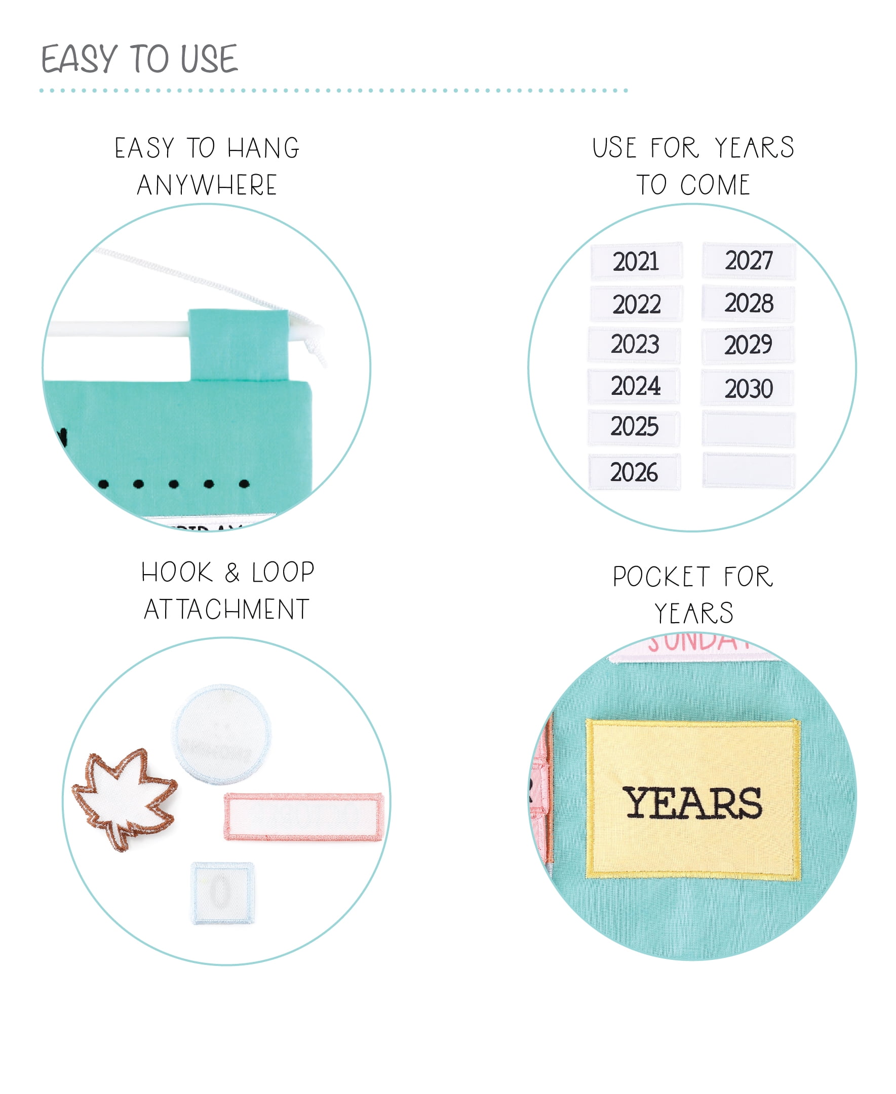 - All fabric pieces are color coordinated between month, year, and season, as well as all 7 days of the week and numbers 0 through 9 with two numbers 1 and 2.