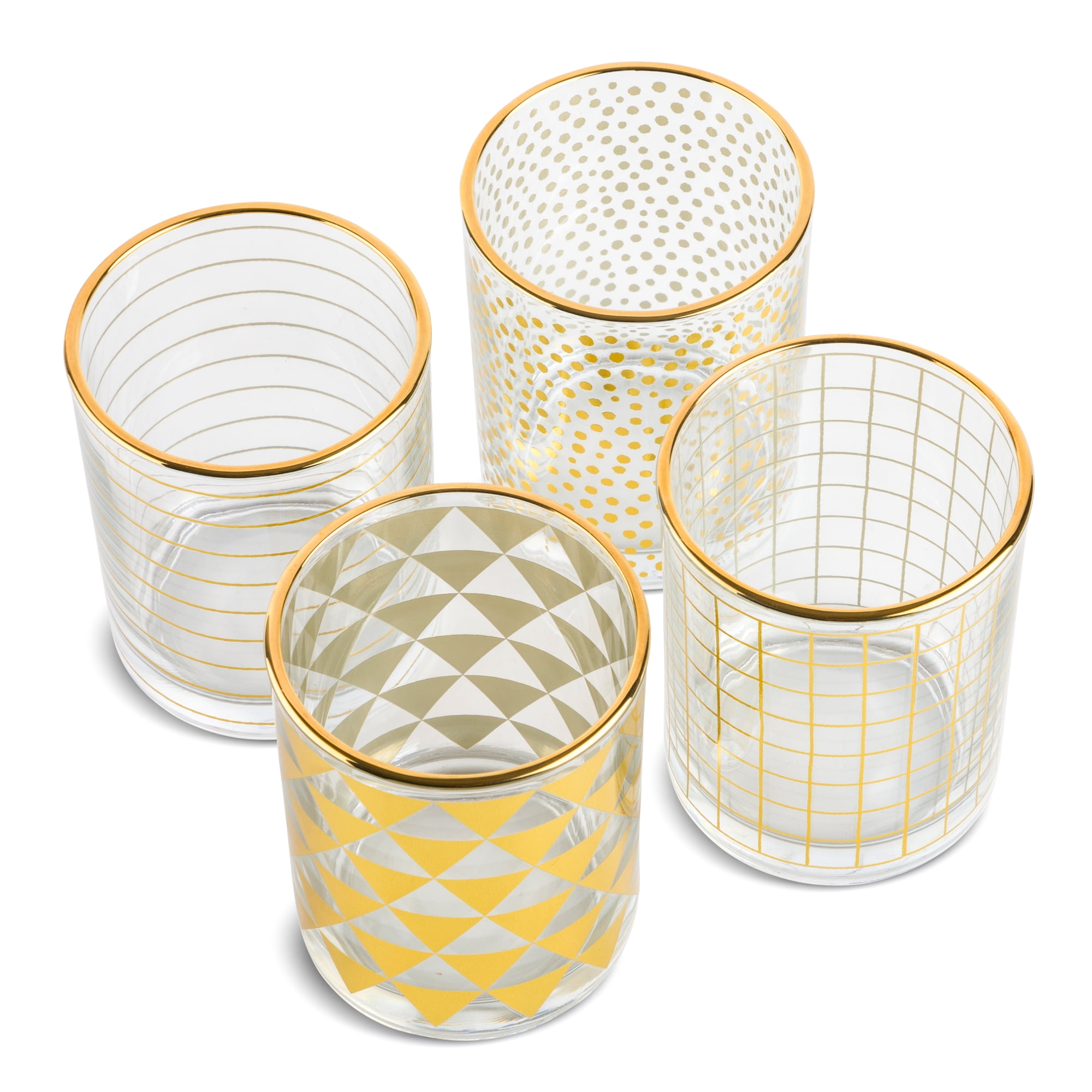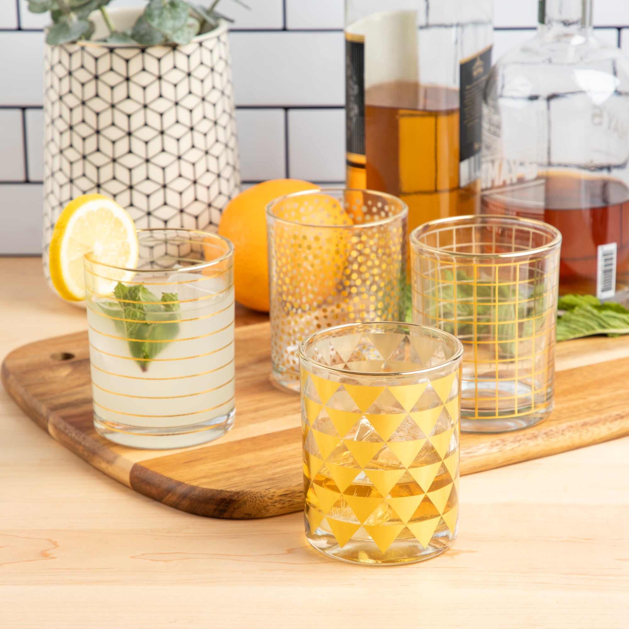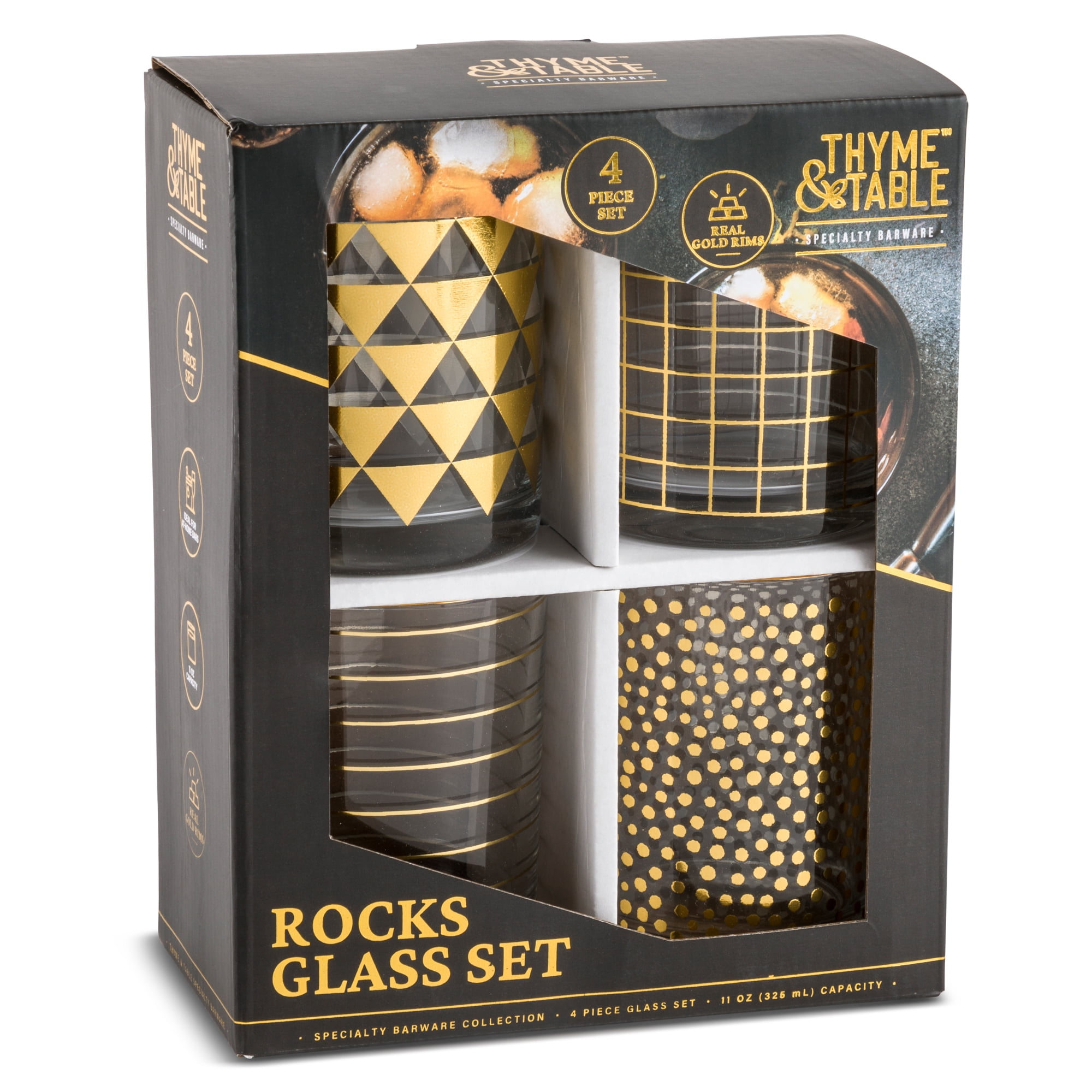Thyme & Table Rocks Glasses, 11 oz, 4 Piece Set is a part of Thyme & Table’s Specialty Barware Collection. This rocks glass set features real gold rims, perfect for entertaining or making any drink feel elegant. This rocks glass set is perfect for any home bar and includes four unique designs. For care and use, please hand wash in warm water with light dish soap and a soft sponge. Avoid abrasive cleaners. Towel dry. Do not use in a dishwasher