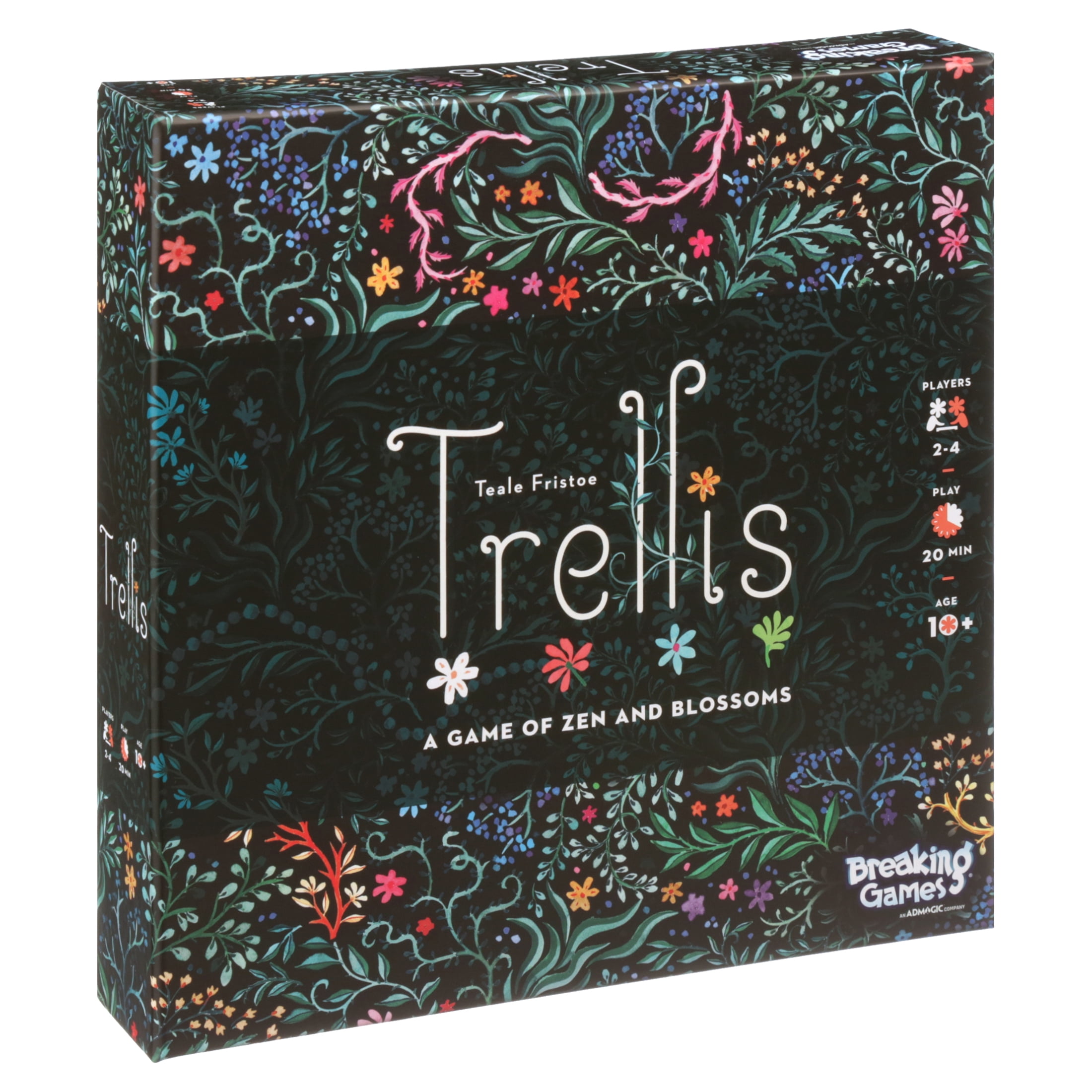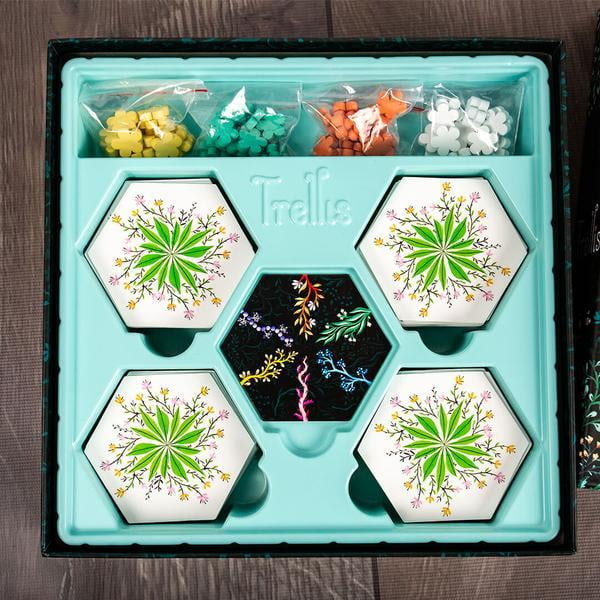 Trellis is a game where players plant tiles in order to create a growing puzzle of beautiful vines. Each tile adds more vines and an opportunity to grow flowers that bloom through matching colored vines. First to play all their flowers completes the Trellis.