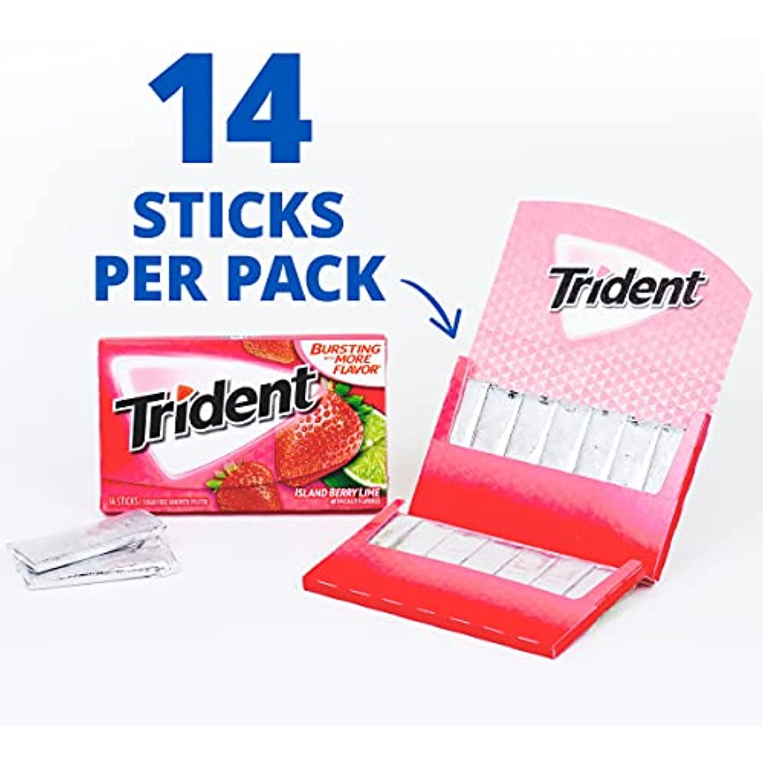 Trident Island Berry Lime Sugar Free Gum is a fruity and delicious way to get fresh breath and protect your teeth. Stranded on a desert island? Youll want flares and a few sticks of this tangy, sugar free berry gum. With 30% fewer calories than sugared gum, Trident lime gum is sweetened with xylitol, a naturally occurring sugar alcohol. The ADA Council on Scientific Affairs found that the physical act of chewing Trident sugarless gum for 20 minutes after eating stimulates saliva flow which helps to prevent cavities by reducing plaque acids and strengthening teeth. Bulk gum packs give you extra Trident berry gum to stock your company or small business, or stock up on chewing gum for party favors. The individual packs of gum are designed so the sticks stay inside, making it easy to toss in your car, backpack or desk drawer. The sticks of fruit gum in each pack of gum are individually wrapped for extra freshness. Whenever you need a long lasting chew, choose Trident Chewing Gum.