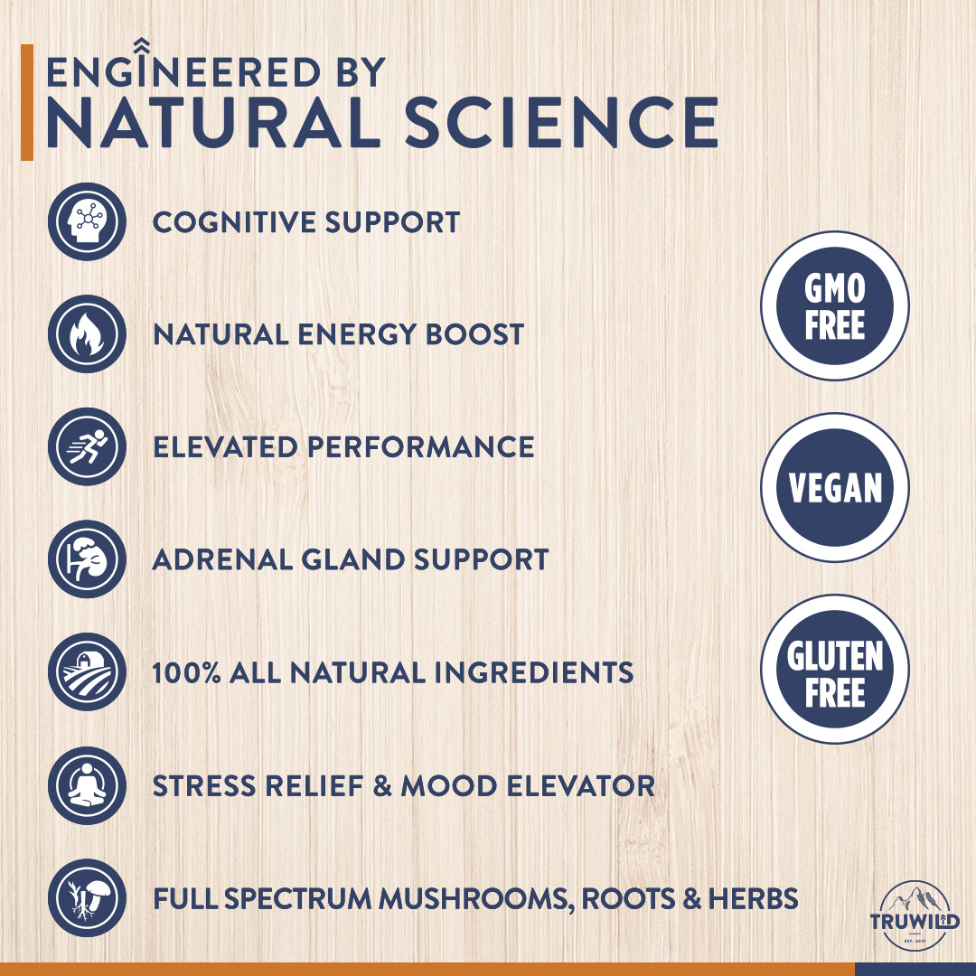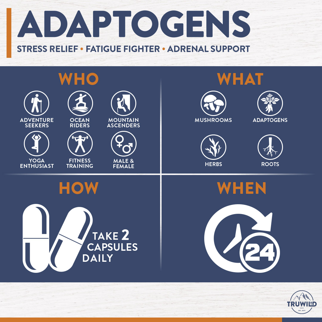 We use high-quality, handcrafted ingredients from nature, not a lab. Our all-natural whole-food products are specifically formulated with no synthetic ingredients, fillers, dyes, or chemicals. TRUWILD Adaptogen supplement (60 Vegetarian capsules) uses the most powerful mushrooms, roots, and herbs to combat stress, fatigue, and balance the immune system. The ingredients include Maca, Ashwagandha, Gotu Kola, Cordyceps, Astralagus, Eleutherococcus, Holy Basil. Adaptogens combat physical, mental, and emotional stress by supporting the body’s ability to adapt to stressors. Chronic stress can lead to elevated cortisol levels and eventually adrenal fatigue. We recommend taking two capsules per day to help support a balanced and healthy lifestyle and to keep you energized, positive, and owning your day!