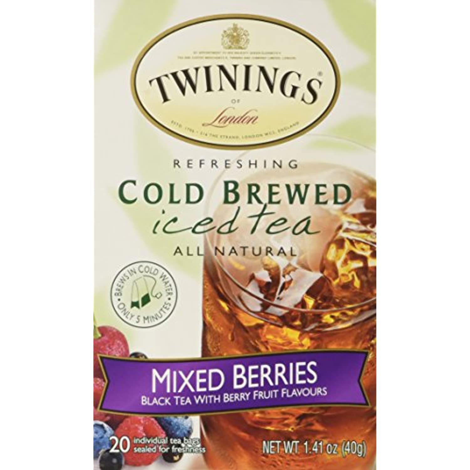 Enjoy Twinings Cold Brew Mixed Berries Iced Tea(20 ct). Twinings has perfected the art of delivering a glass of refreshing iced tea in just minutes! So innovative and easy-to-use, you no longer have to wait for the water to boil, bags to brew and tea to cool. Simply add water, let stand, add ice and minutes later your refreshing iced tea is ready to drink. Twinings Mixed Berries is a delicious black iced tea created to enliven your senses and quench your thirst. Expertly blended, this full-flavoured iced tea combines the finest black tea with the luscious fruit flavours of cherry, blueberry, blackcurrant, and raspberry. (Note: description is informational only. Please read product label prior to use and consult your health professional with any question prior to use.