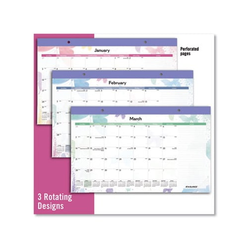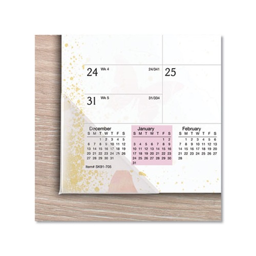 Features three rotating watercolor designs to brighten any space. One month per page with unruled blocks and lined notes space. Full-year calendar reference. Paper top binding with two eyelets for easy hanging and clear poly corners to keep edges from curling up. Perfect for cubicles or crowded work spaces. Perforated pages for clean and easy removal. Printed on high-quality with superior ink bleed resistance. Size: 17.75 x 11 Page Color/Theme: Watercolors Edition Year: 2021 Calendar Term: 12-Month Jan-Dec.