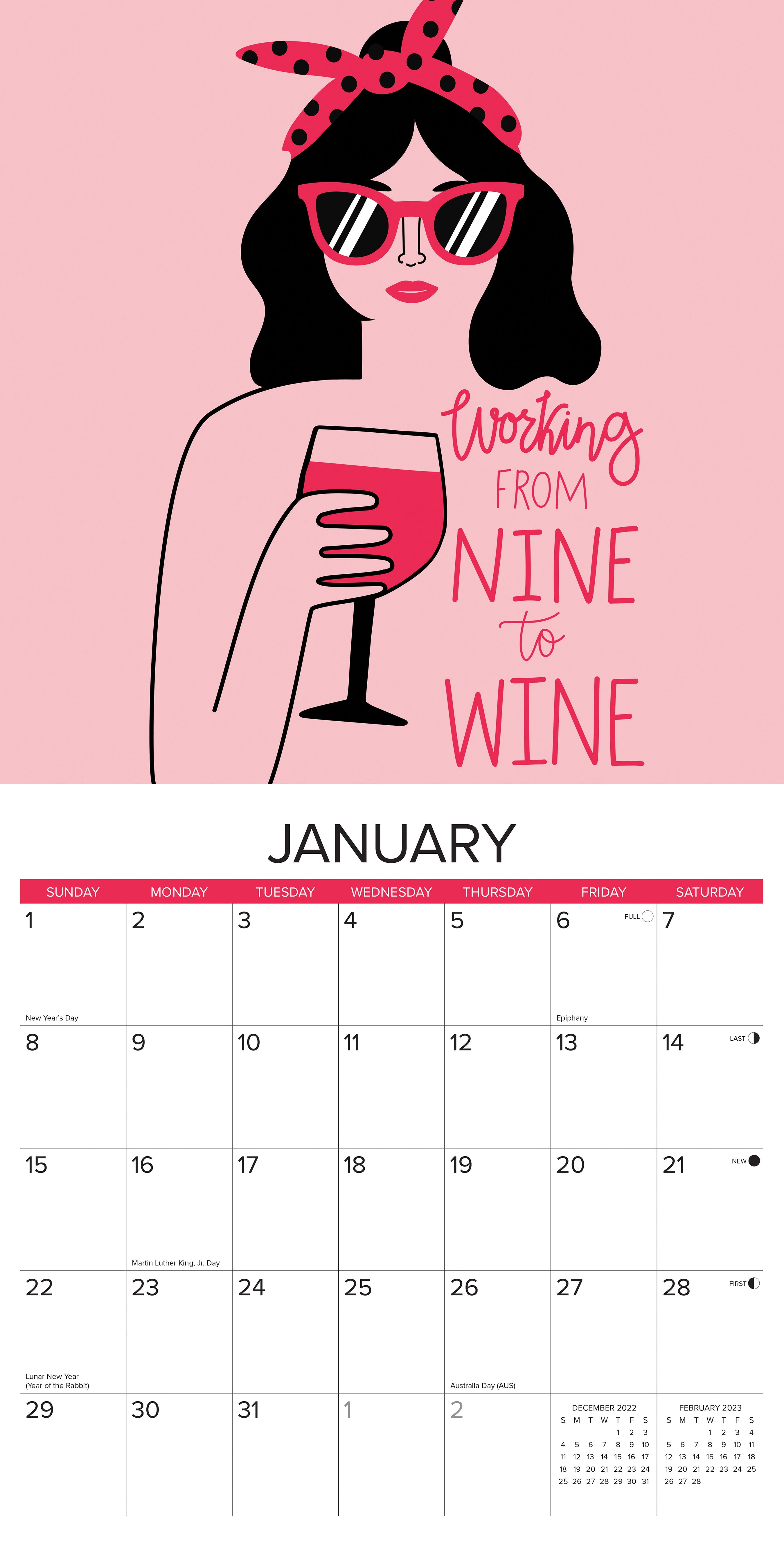 Life is short, so Wine Not! The witticism of this wine-centric calendar is sure to charm you. Illustrated quips inspired by your favorite crisp white, a blushing rosé, or jammy red talk about the joys of imbibing with friends, sneaking a glass of mom juice in the pantry, and prioritizing life choices like saving your carbs for wine. Not the least bit complex, with a long, lingering finish, each month will make you smile and appreciate the miracle born of the simple grape. Printed with soy-based inks on FSC certified paper, the calendar features large monthly grids that offer ample room for jotting notes, along with six bonus months of July through December of 2022. Also includes moon phases (CST), standard U.S. and international holidays.