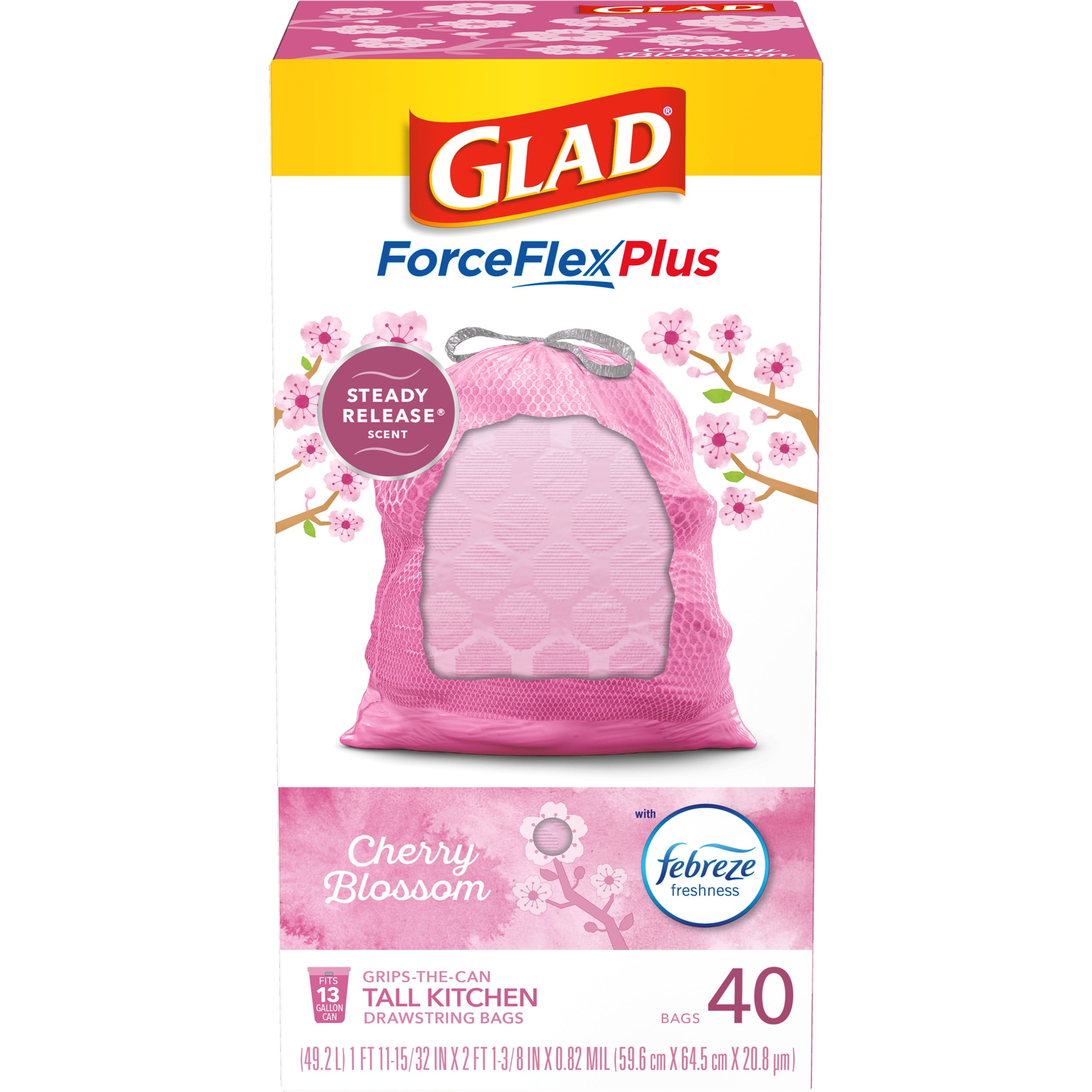 Glad ForceFlexPlus Tall Kitchen Drawstring Trash Bags, 13 Gal, Febreze Cherry Blossom, 40 Count
