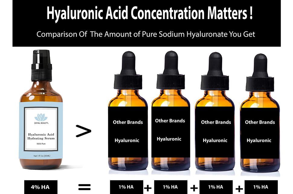 Highest pure hyaluronic acid concentration on the market. Highest 4% sodium hyaluronate solution. Other brands are only 0.5% or 1% solution. Thicker but non-greasy, smoother and more effective.