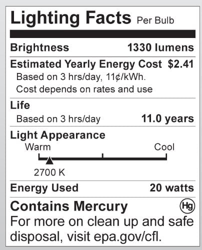 20 watt; Mini Spiral Compact Fluorescent; 2700K; 82 CRI; Medium base; 120 volts