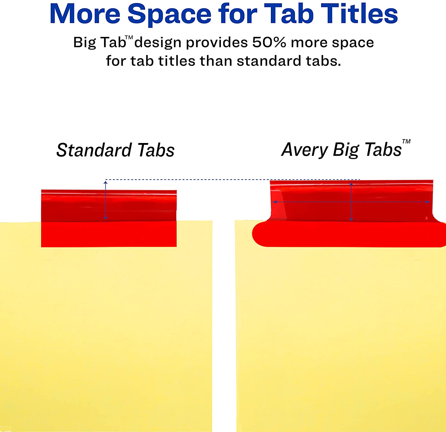 8-tab binder dividers with insertable big tabs are a fast and simple solution to paper organization. Big tab dividers provide enhanced tab visibility with 50% more writing space than standard divider tabs, allowing for bigger fonts and handwriting. Special tab design keeps inserts locked in during use, but the easy-access slot makes them painless to remove. These page dividers are made of durable buff colored paper, with double-sided gold reinforced holes that are tear resistant so you can flip through your 3-ring binder with confidence. Sturdy and built to withstand everyday use, this multicolor set of 8-tab dividers is great for organizing schoolwork, personal finances, recipes, coupons, sheet music, or anything else that needs sorting. Tabbed dividers are 3-hole punched and ready for immediate use. For a clean, professional look, personalize your page tab inserts using free templates, fonts and designs. Inserts are compatible with laser and inkjet printers.