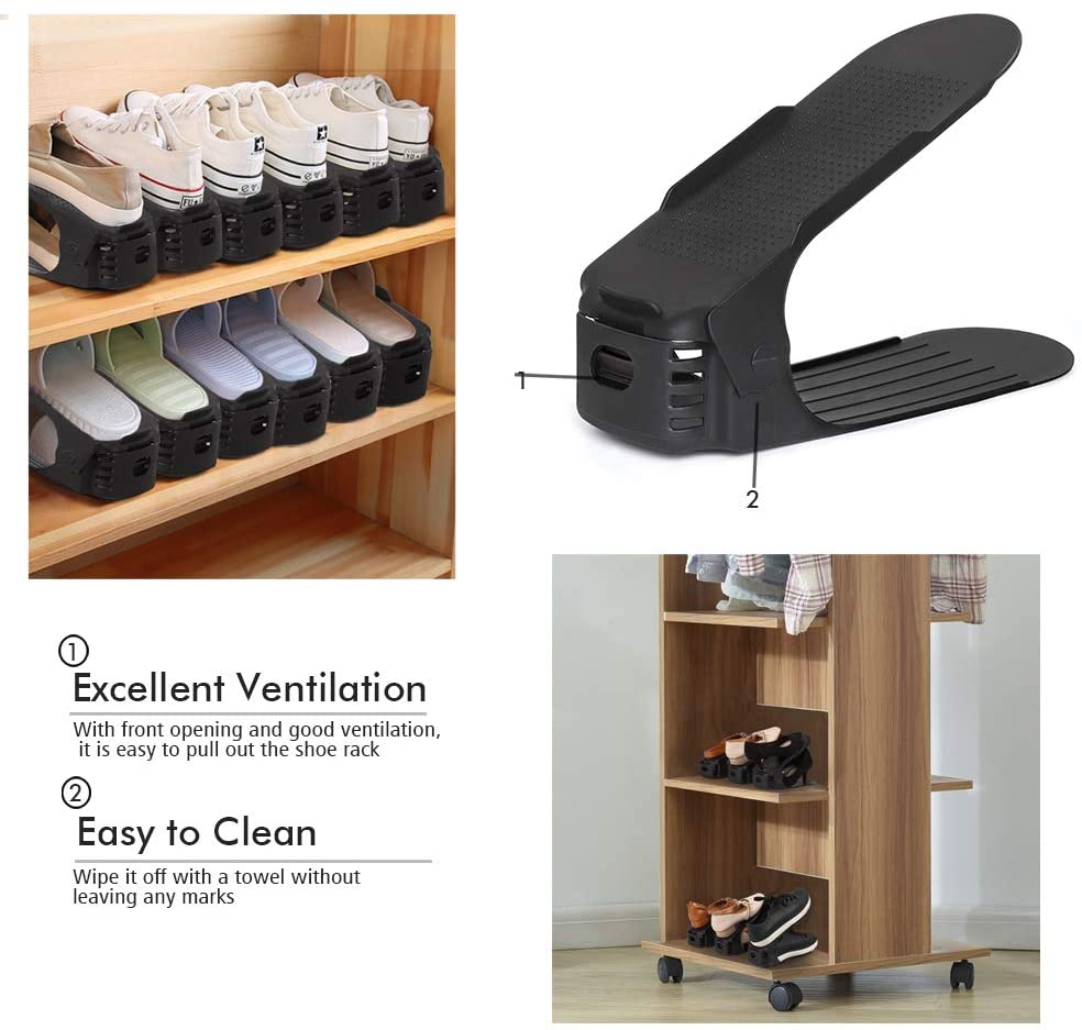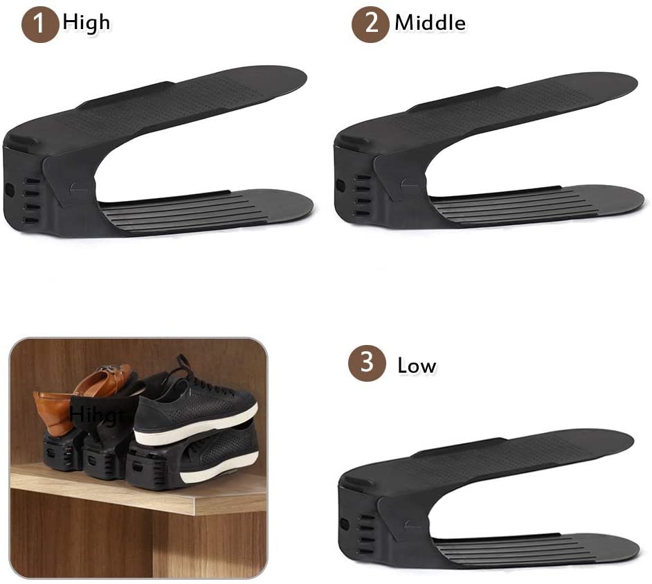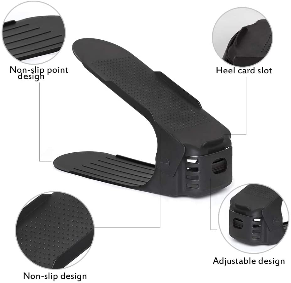 Double your storage space and save you half the space! Three adjustable heights to meet all your needs, choose the high heels, sandals, and sneakers you want to store, meet all types of shoes in different height up to 7.09 inches. The material has a long service life, durable, non-slip protection and button on the street to create a better protection for your shoes and will not slip off easily. It is suitable for most sports shoes, slippers, high heels and flat shoes, easy for everyone family to use. Specification: Color: Black Material: Plastic Quantity: 10 Pack Size: 9.84 x 3.86 x 2.17 inches Package Content: 10 x Shoe slots
